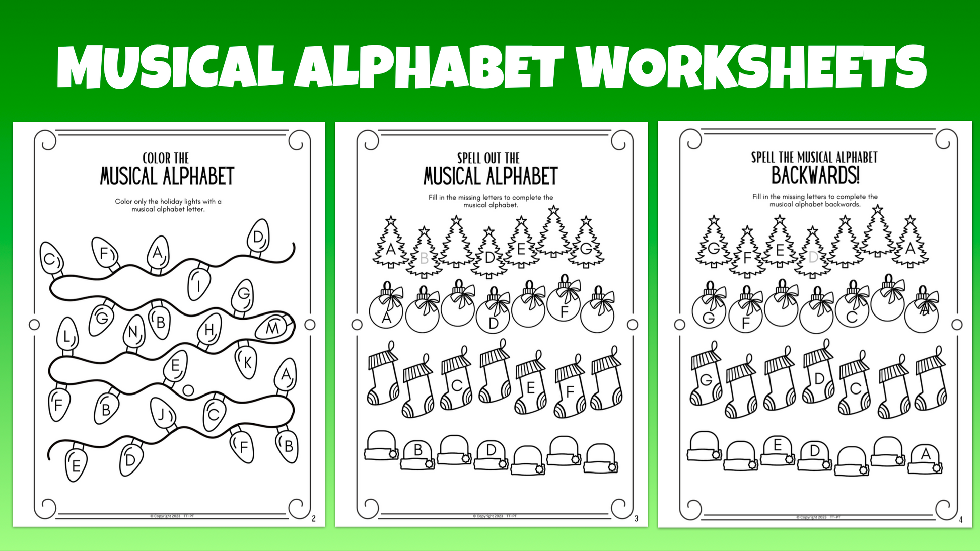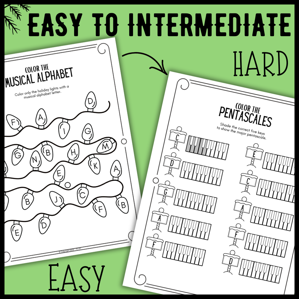 Students will review notes on the staff, rhythms, key names, steps vs. skips, and major pentascales — all with cheerful Christmas-themed illustrations that make learning theory exciting.