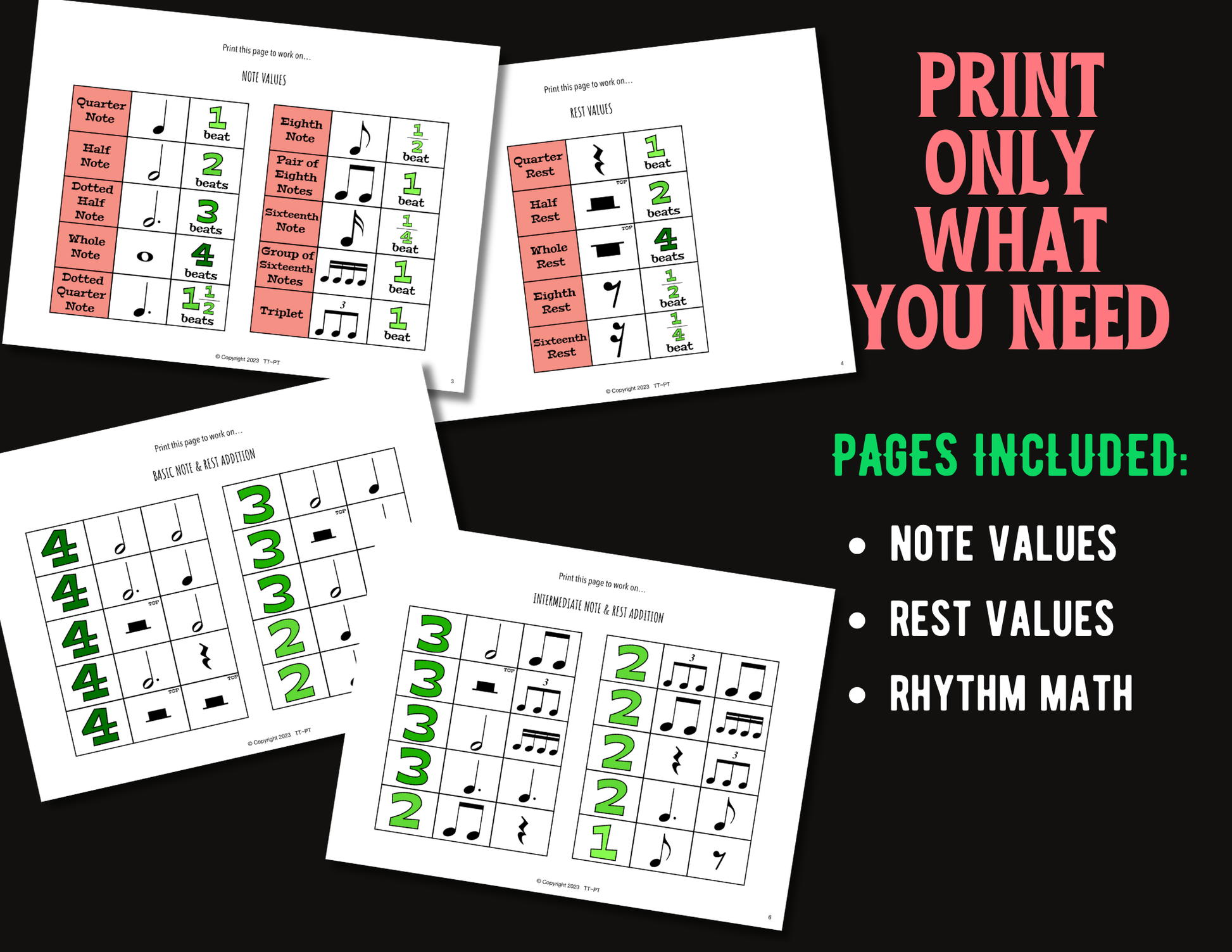 Quarter, Half, Whole, Dotted Half, Dotted Quarter, Eighth, Pair of Eighths, Sixteenth, Group of 4 Sixteenths, Triplet