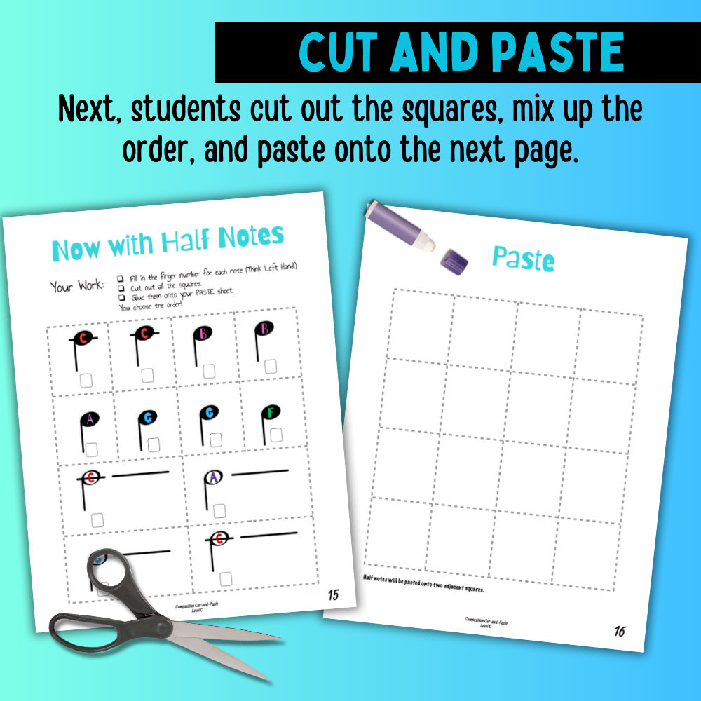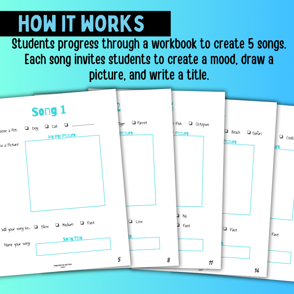 Music Composition Cut-and-Paste Workbook Level C | Beginner Class Workshop Curriculum for Composing a Song on the Piano | Primer Level - Off-Staff Notation