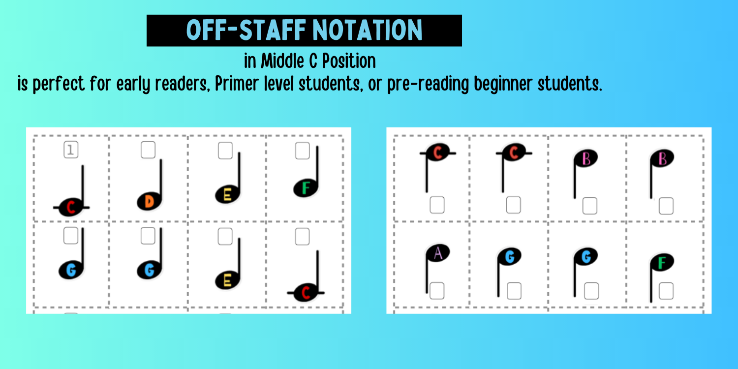 Music theory and early technique are incorporated into the creative process in Level C of the Composition Cut-and-Paste workbook. Students do not need to be able to read any notes on the staff to complete this workbook. Hands stay in the Middle C Position, and notation is Off-Staff.