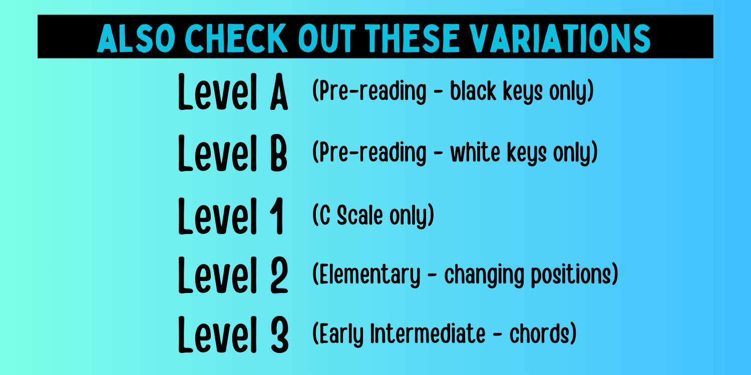 This is a full curriculum designed for pre-reading or Primer Level, beginner piano students who have learned the names of the white keys and played in the Middle C Position. Other levels of Composition Cut-and-Paste are also available (Level A is black keys only. Level B is white keys (no position). Level 1 and up are on the staff.)