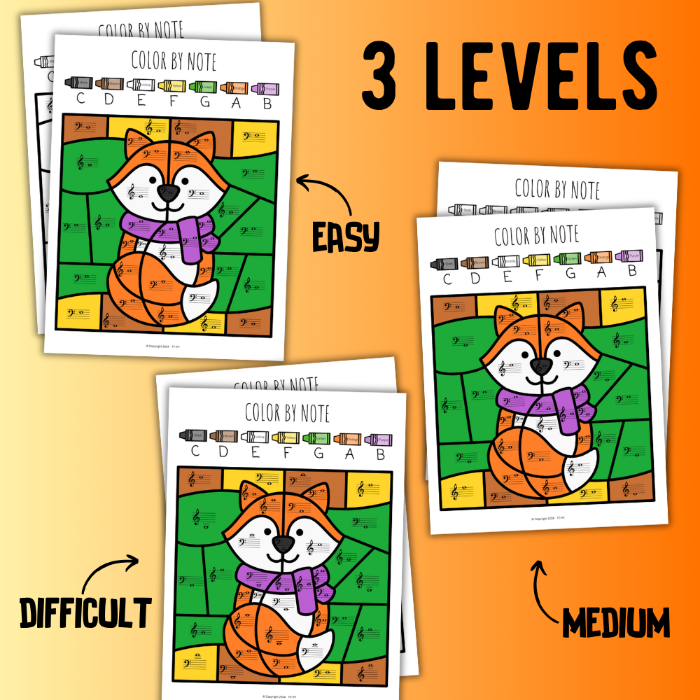 Fall Music Coloring Pages | Color By Code Music Notes | 3 Levels | Note Naming | September, October, November