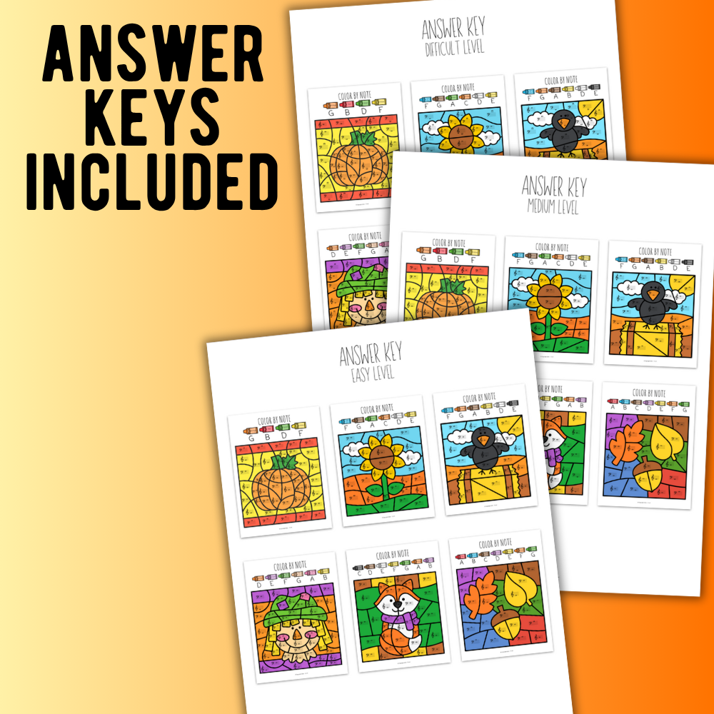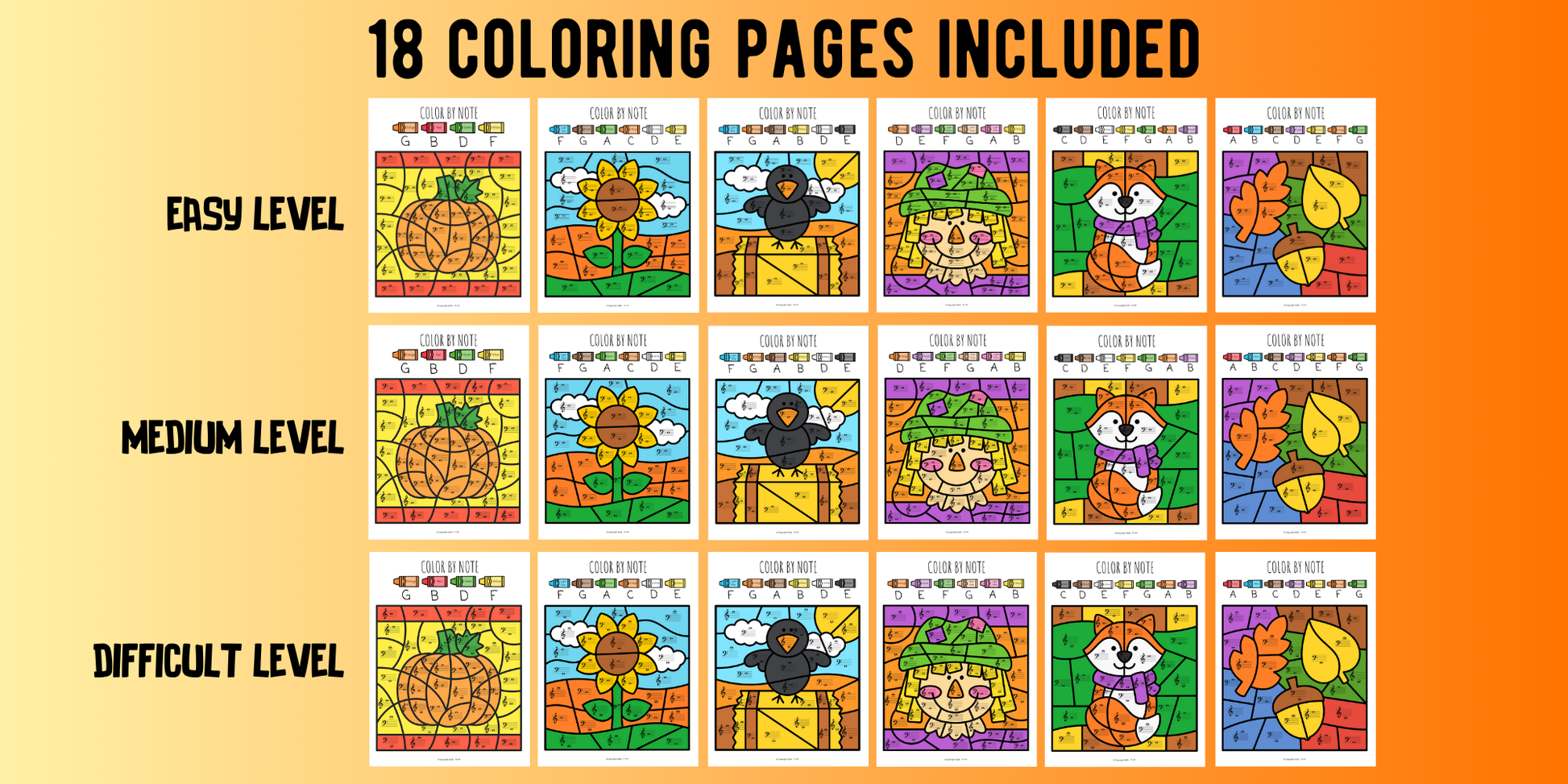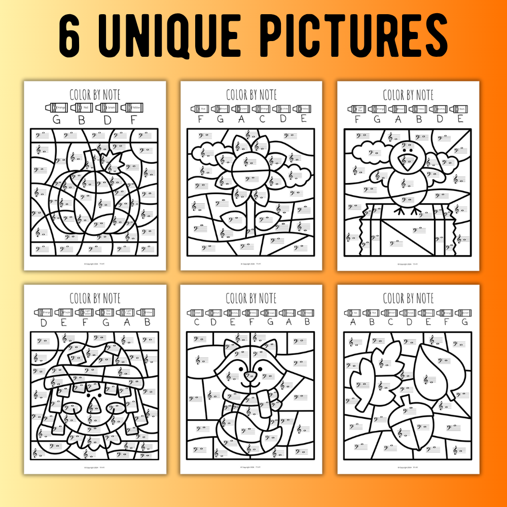 18 No-Prep Print-and-Go Autumn Music Coloring Pages for beginning to intermediate piano students. Printable color-by-code worksheets to identify music notes on the staff. Autumn-themed Coloring Pictures for a fun music theory break this fall!