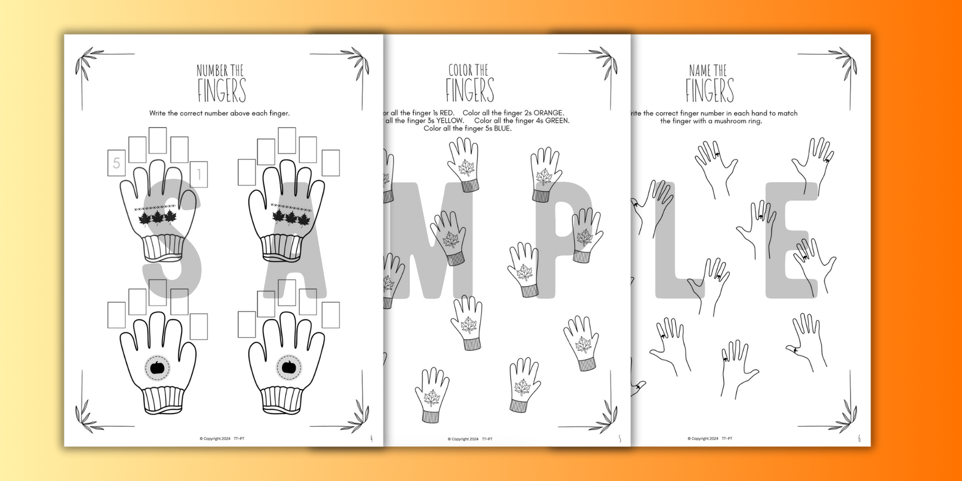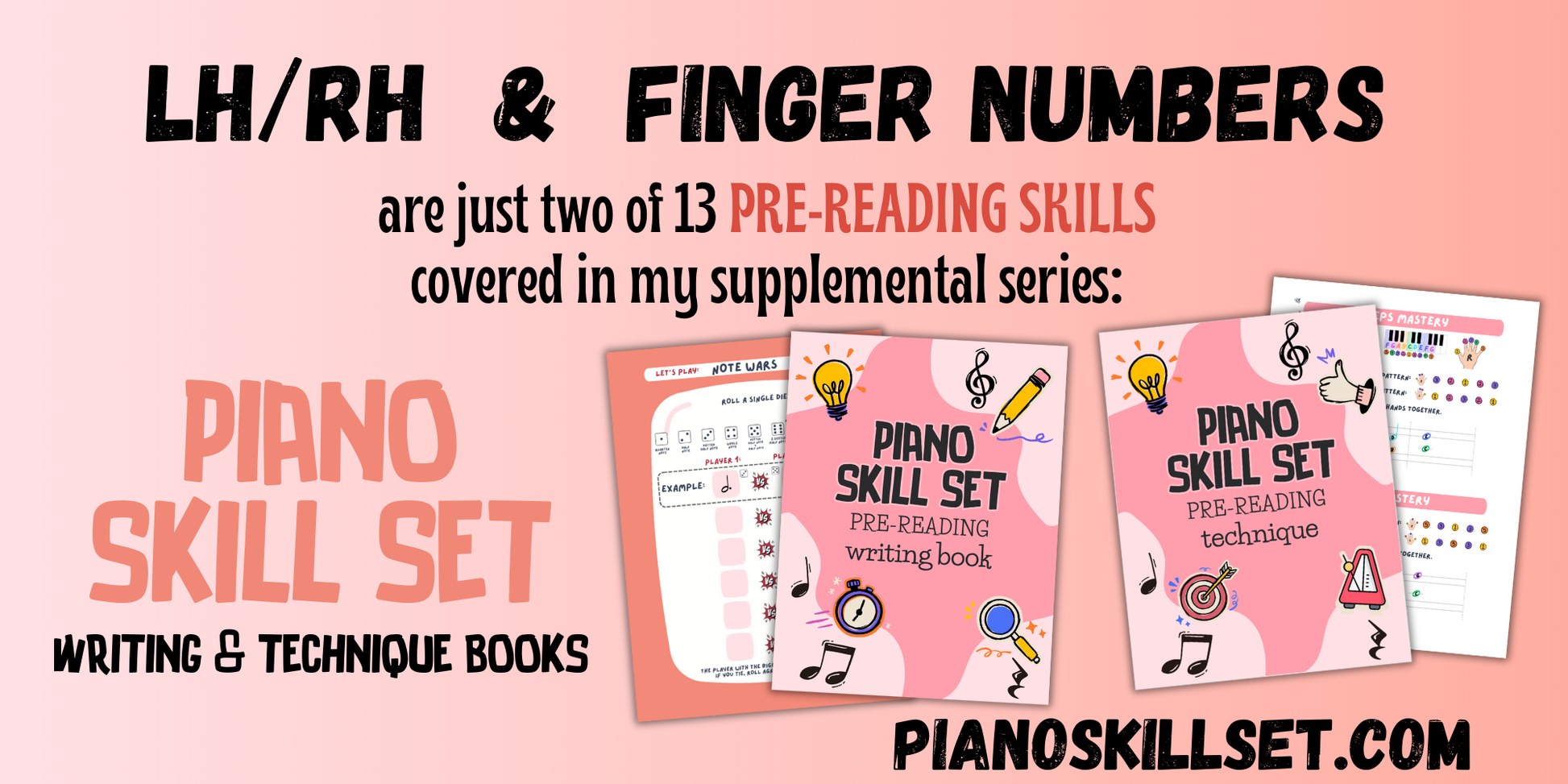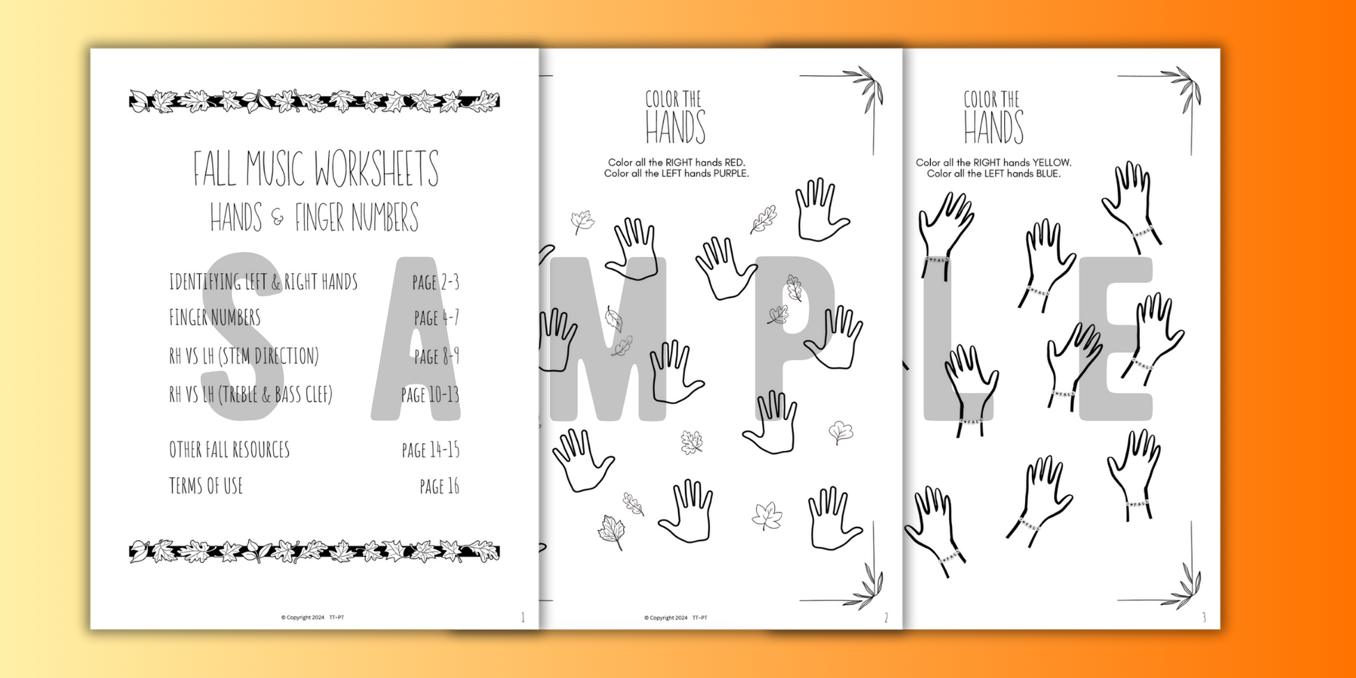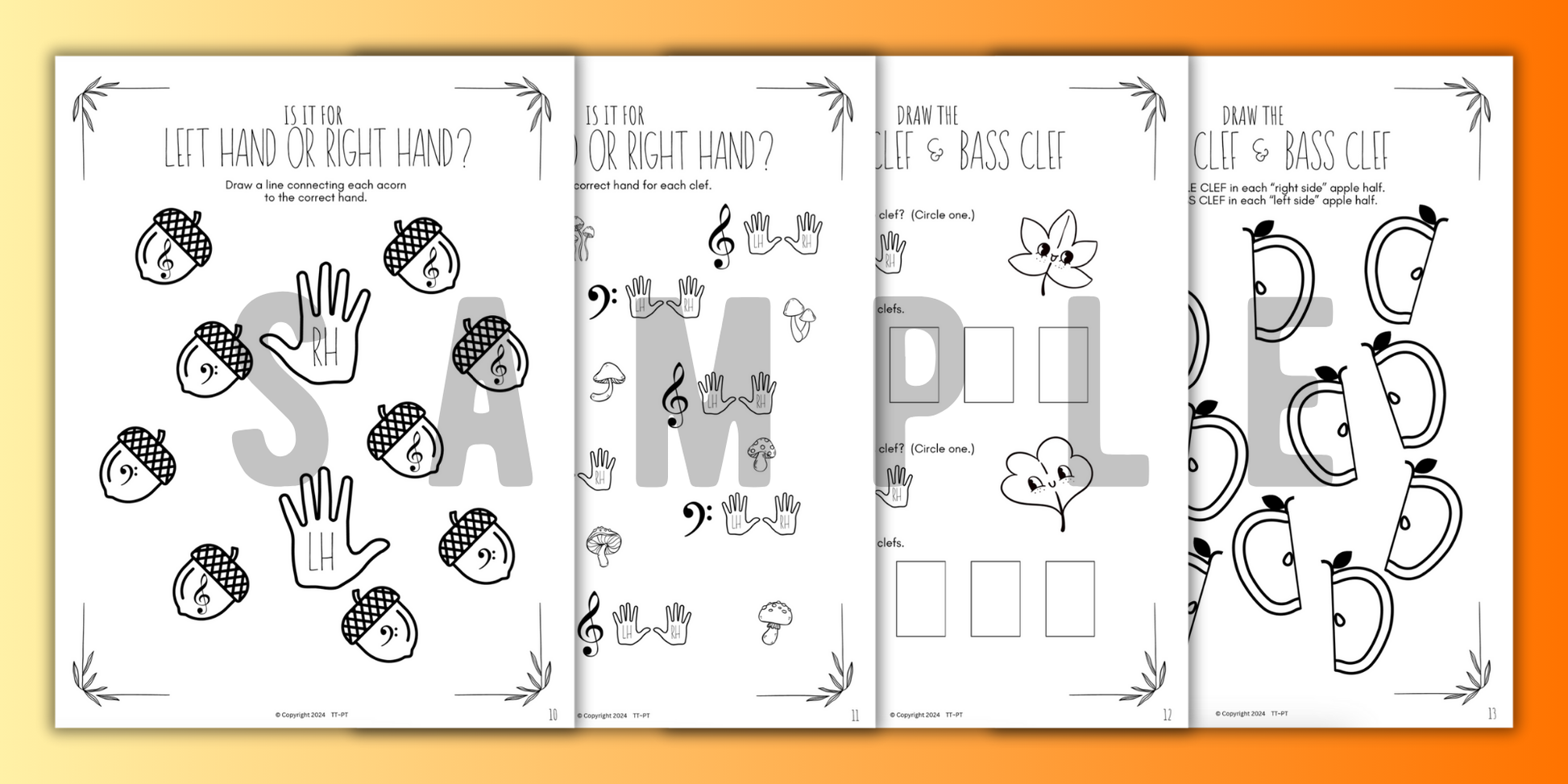Pack of 12 No-Prep Print-and-Go Fall Music Theory Worksheets for beginning piano students. Printable worksheets for the autumn season review finger numbers and left hand / right hand to prepare piano students to learn the white keys of the piano.