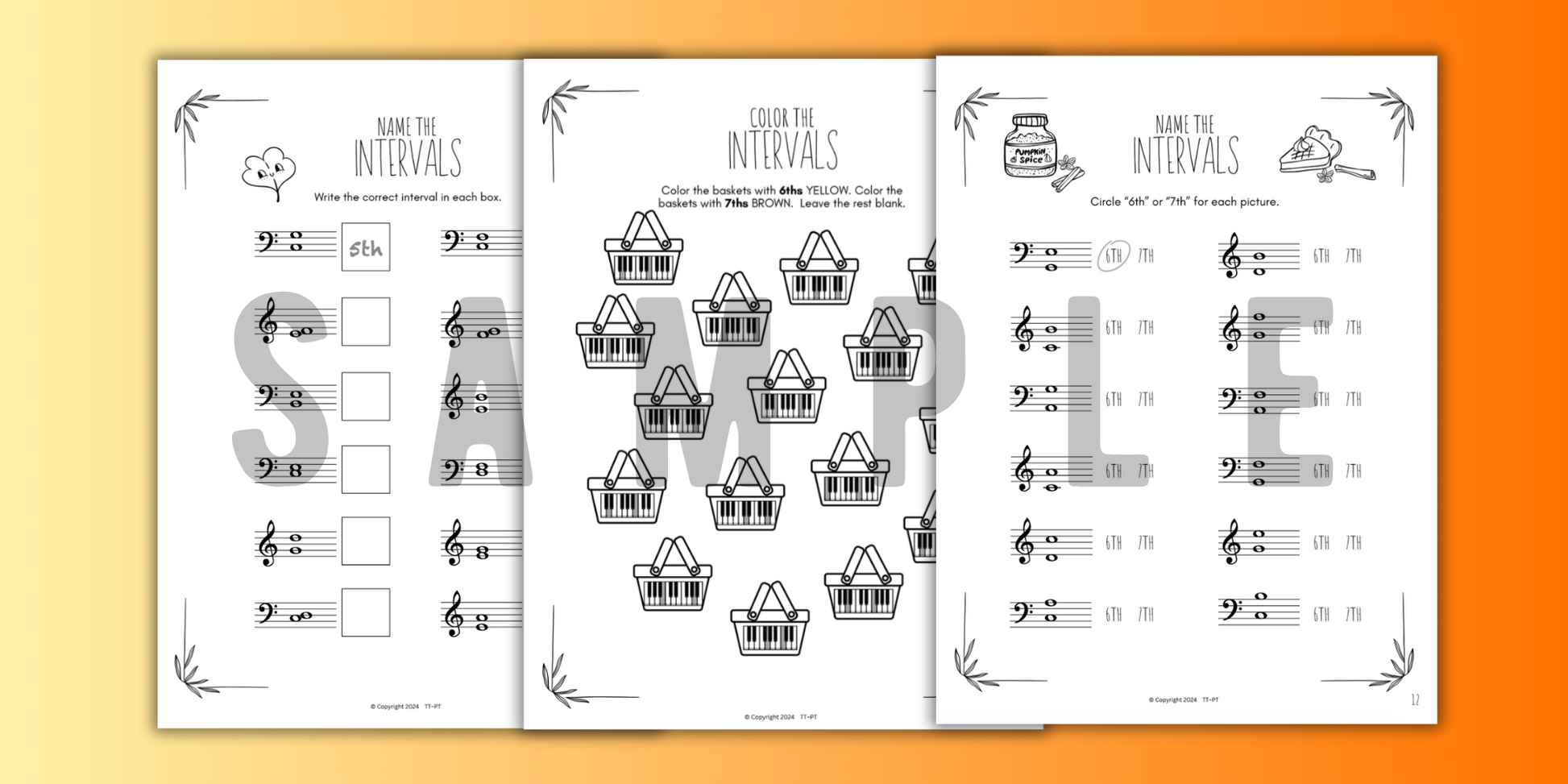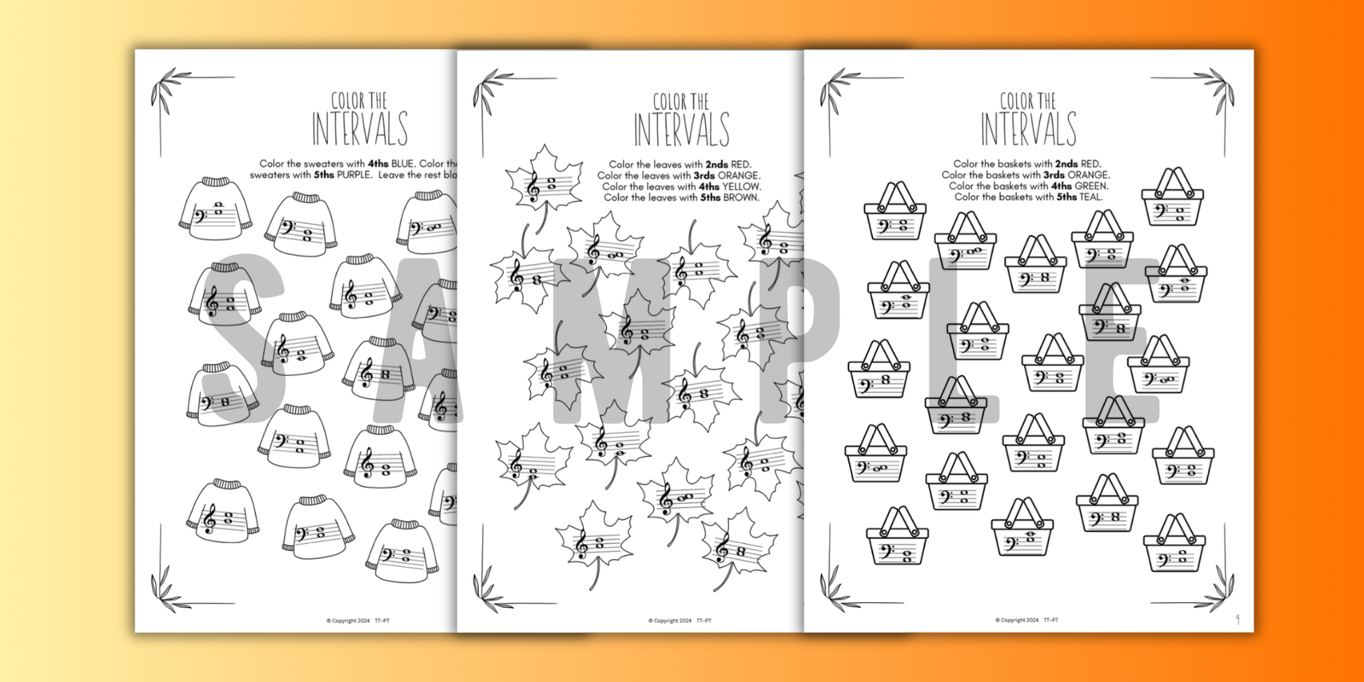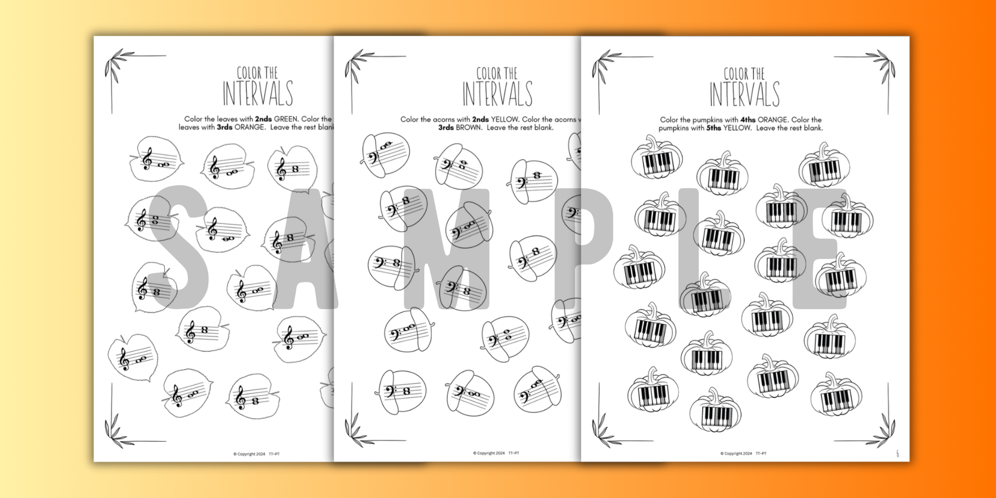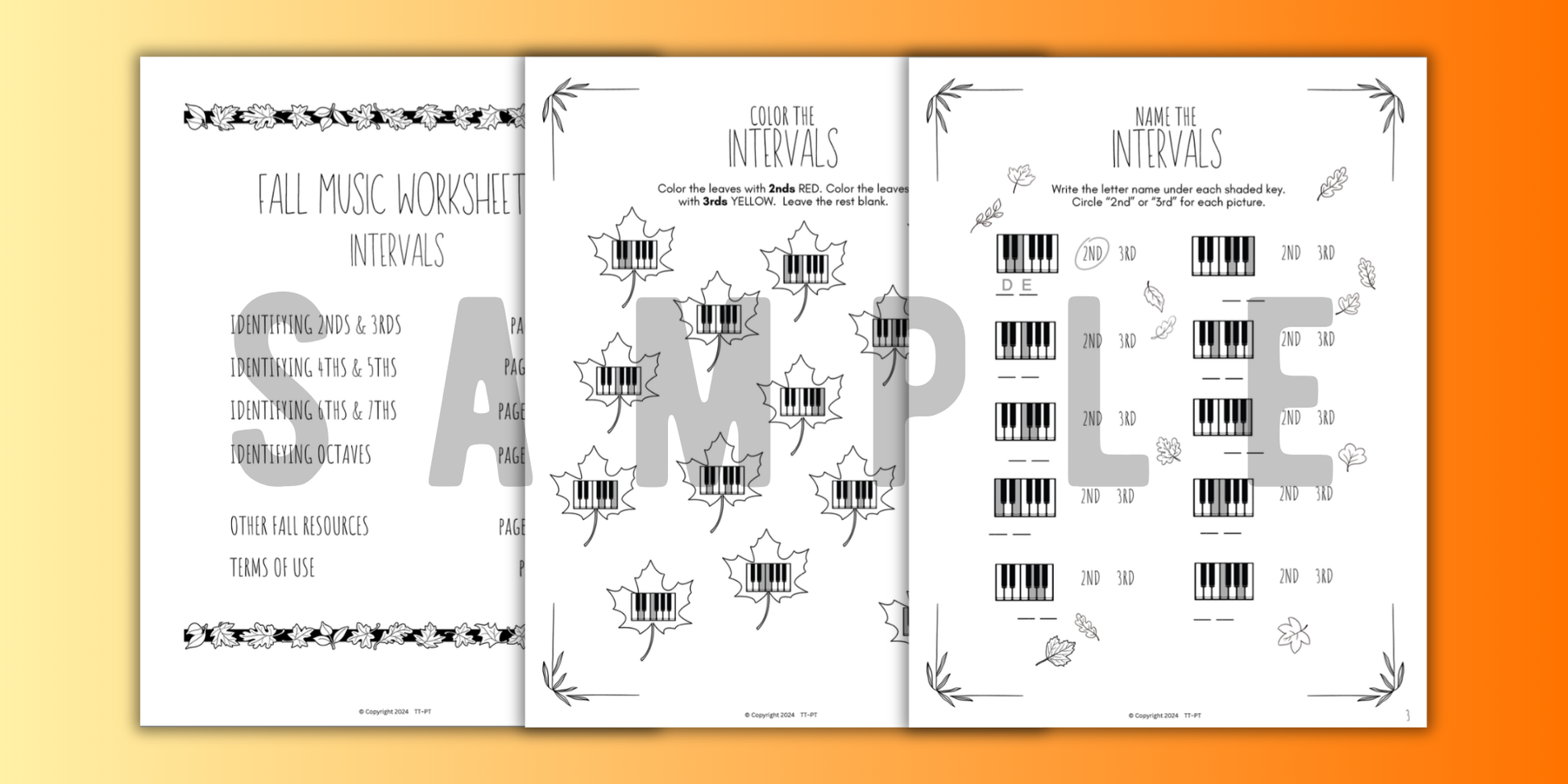 Pack of 15 No-Prep Print-and-Go Fall Music Theory Intervals Worksheets for beginner to intermediate piano students. Printable worksheets for autumn review identifying all intervals on the keys and on the staff.
