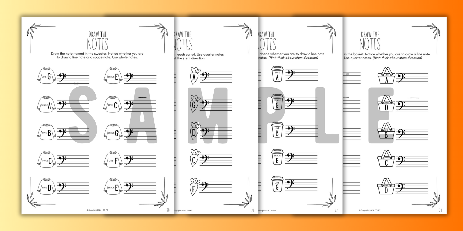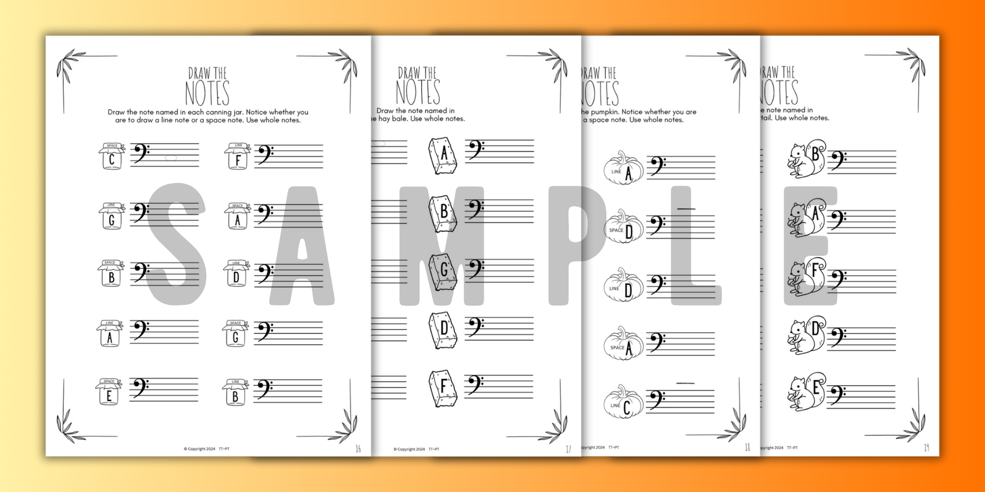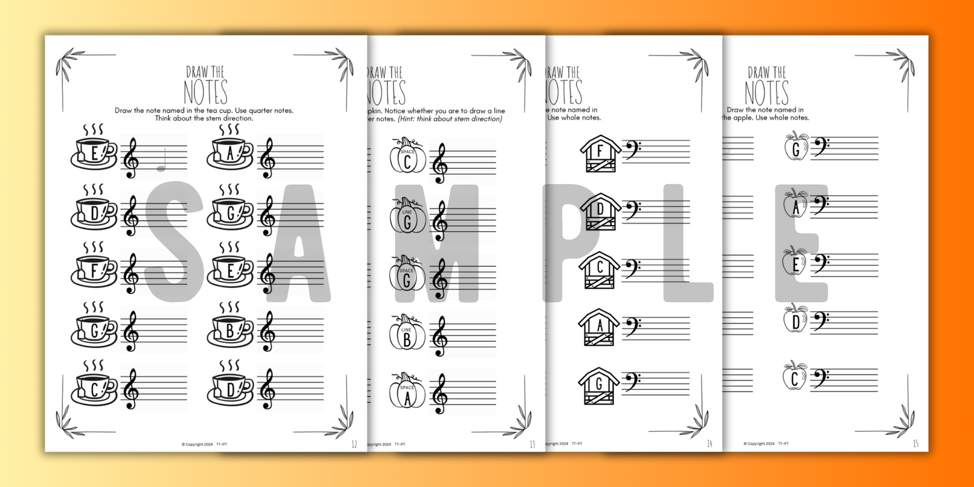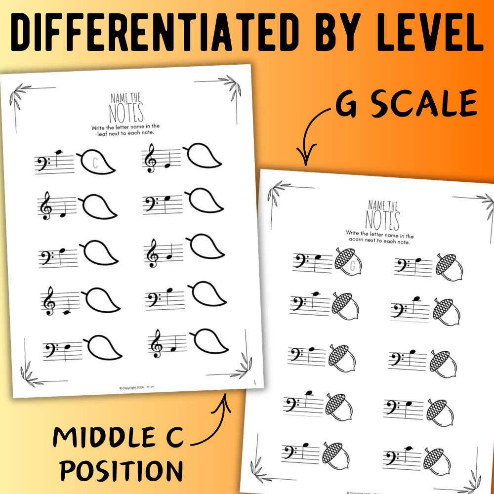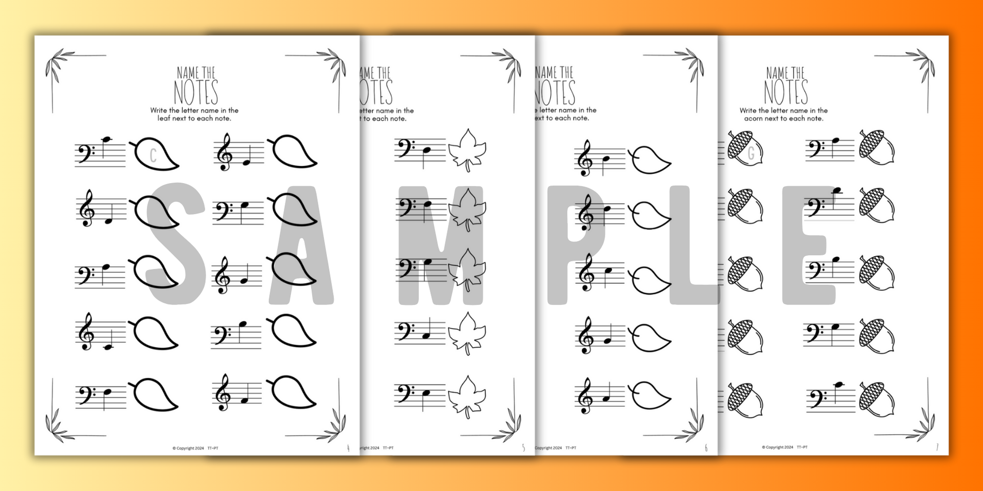 Pack of 30 No-Prep Print-and-Go Fall Music Theory Note Naming Worksheets for beginning piano students. Printable worksheets for autumn review identifying and drawing notes on the staff.