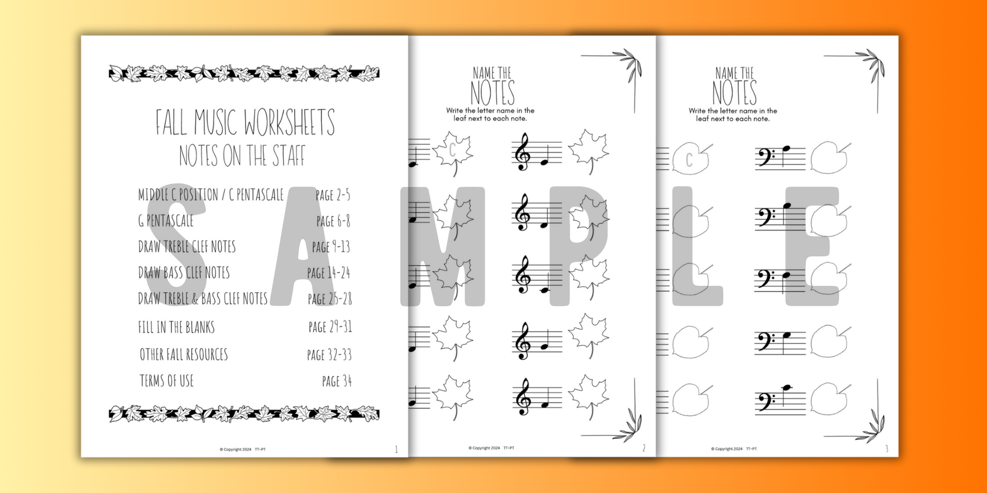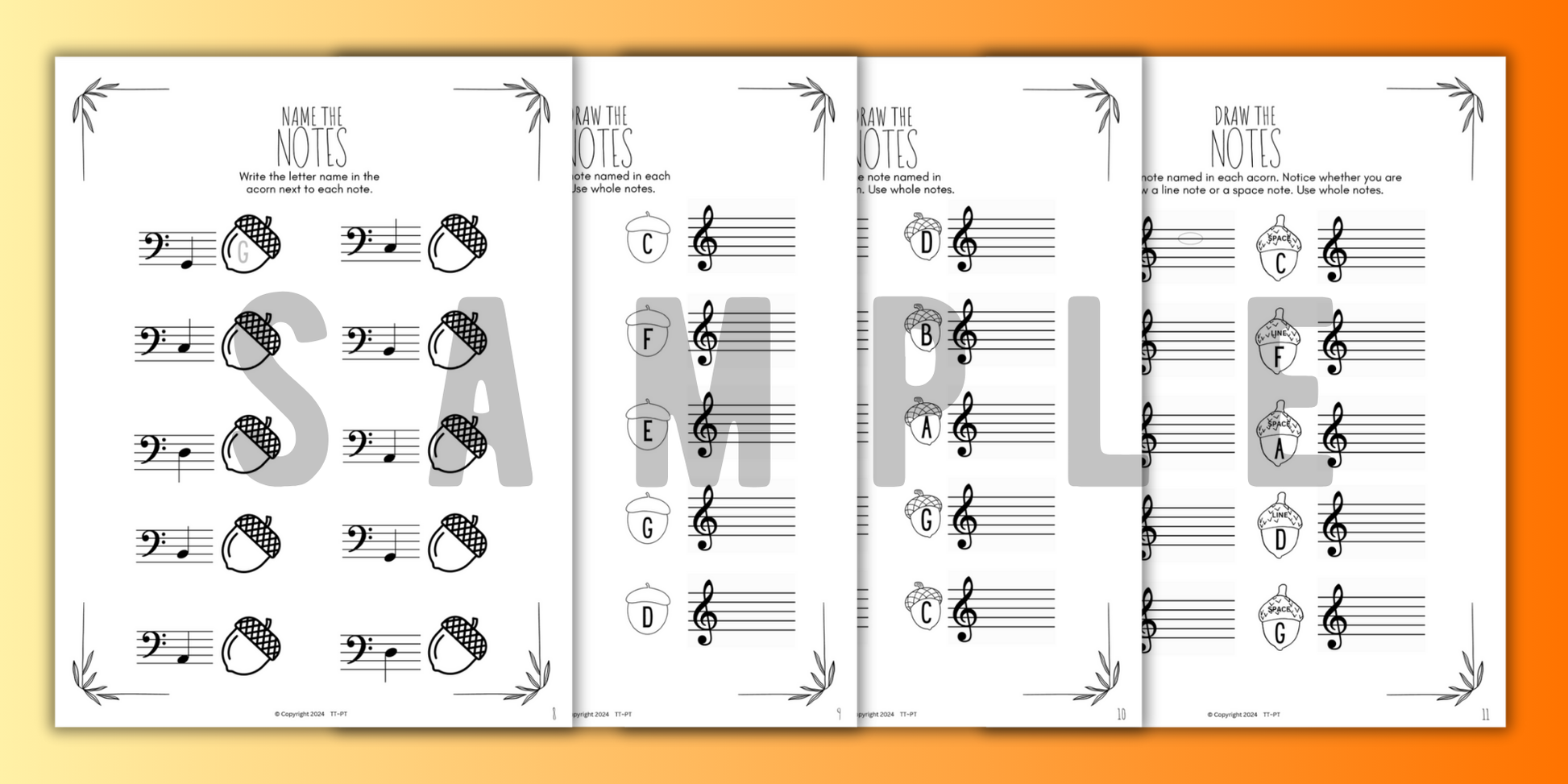 Music Theory Worksheet Pack | Notes on the Staff | Fall Theme | September, October, November