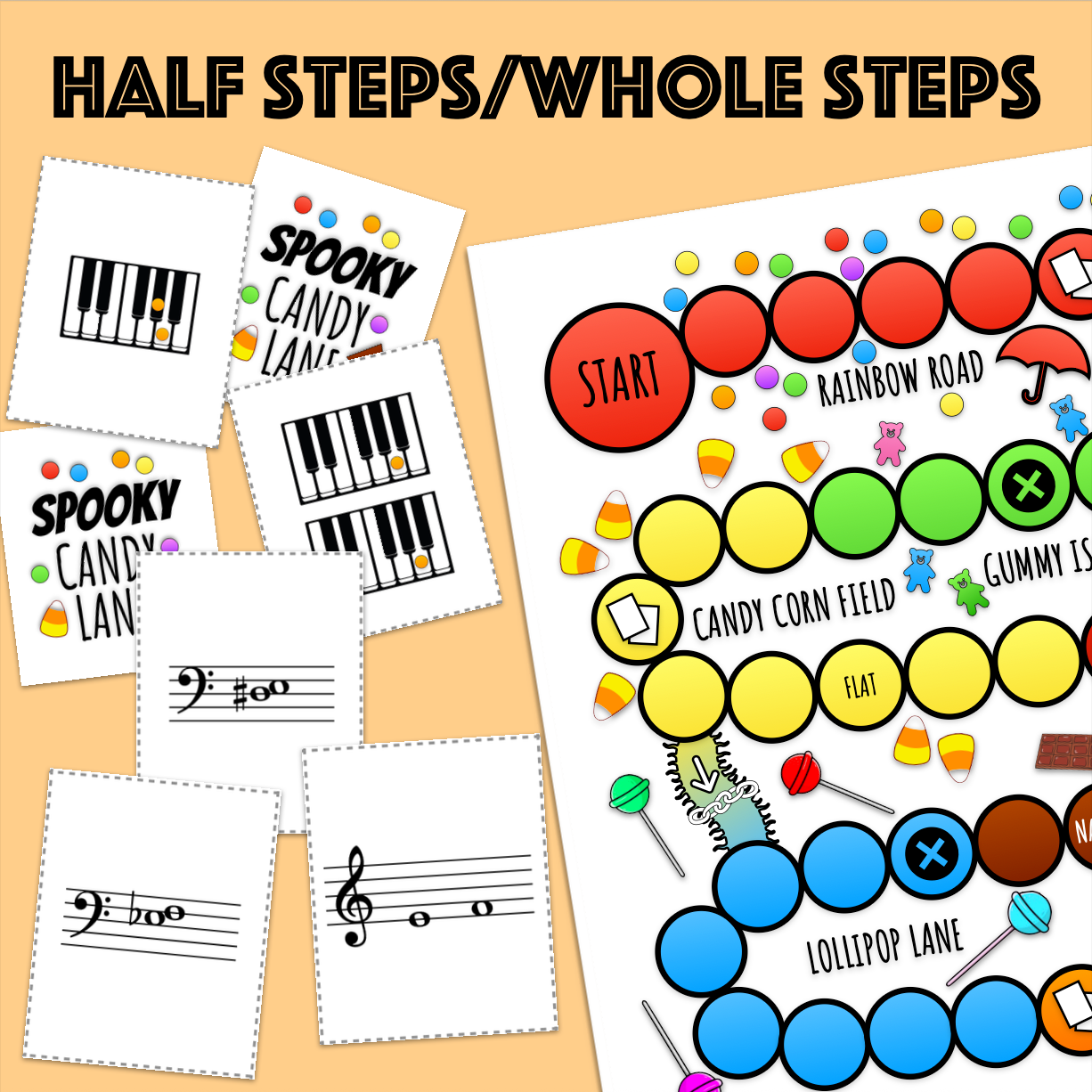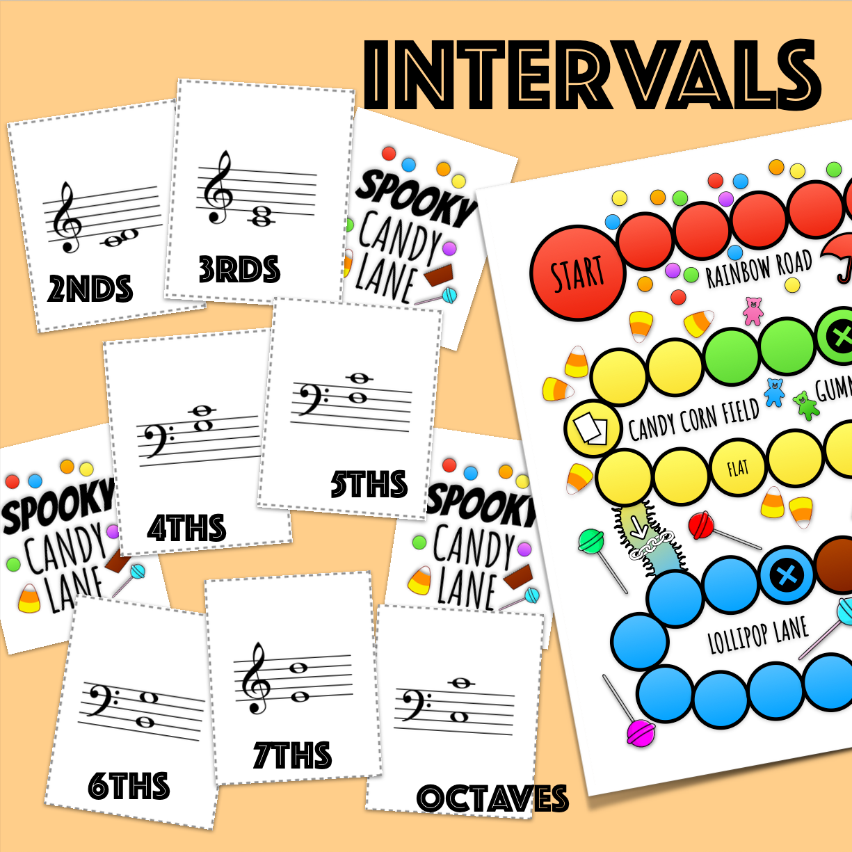 Halloween Music Game Bundle to Review Music Intervals and Notes on the Staff. This not-so-spooky candy-themed board game is a big hit with my students! Easy to learn and play for all ages, beginners to intermediate.