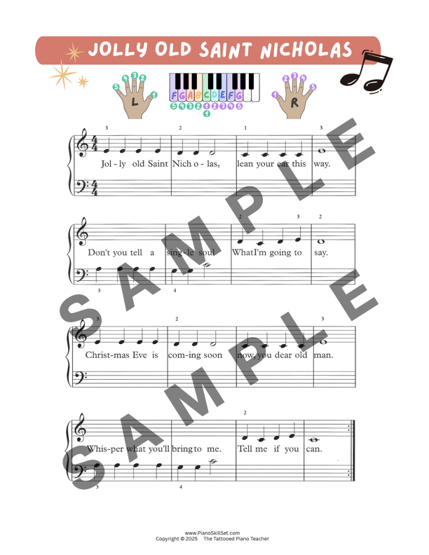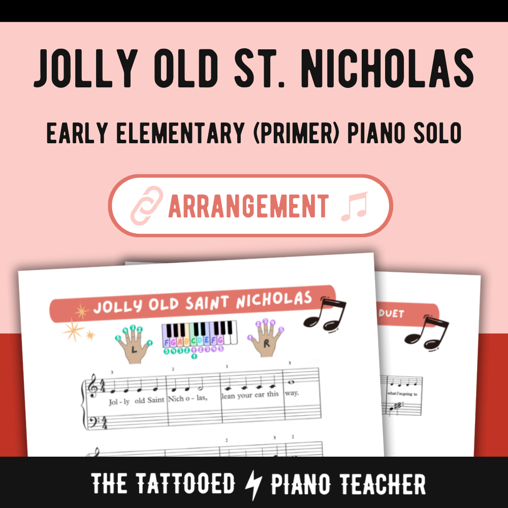 For an easier version of this piece, check out my Pre-Reading (black key) arrangement of Jolly Old St. Nicholas.
