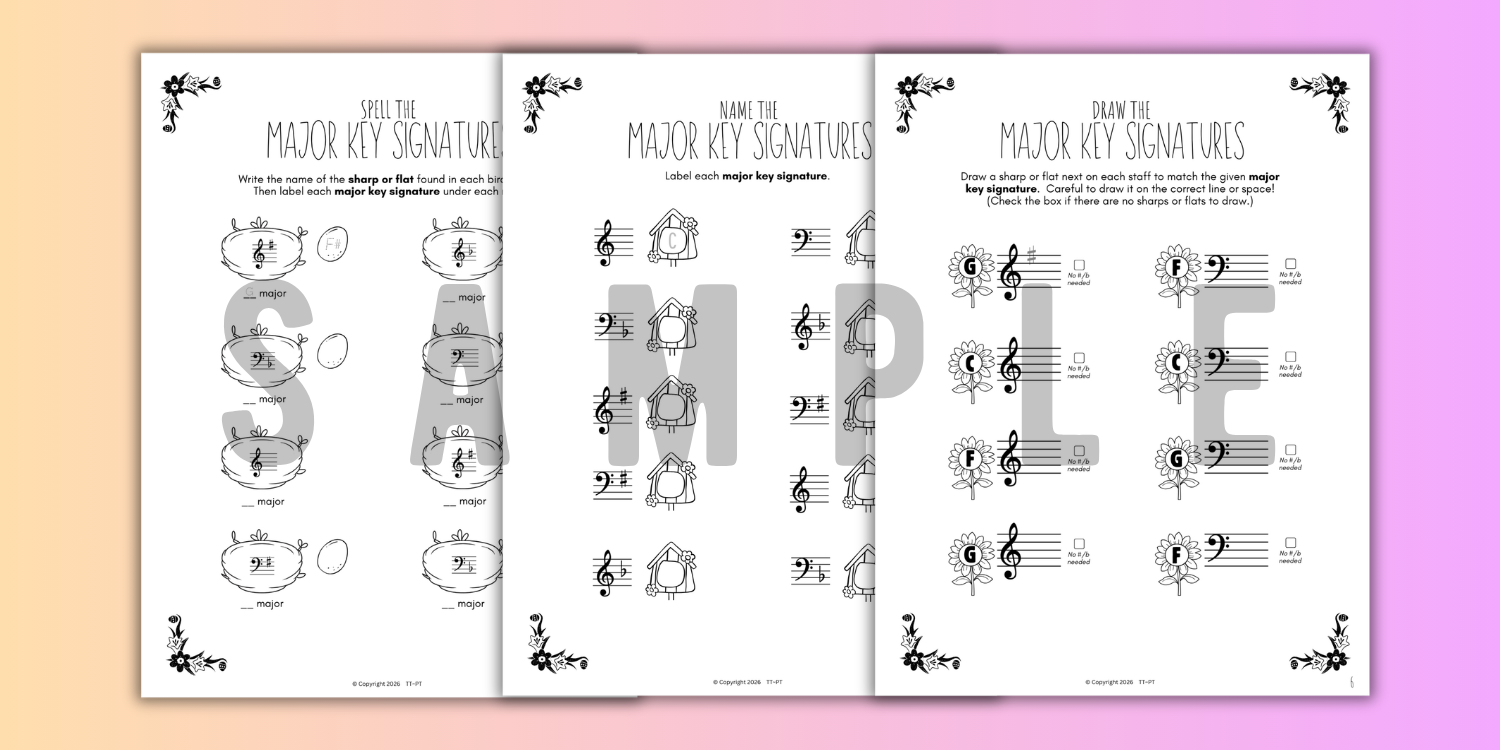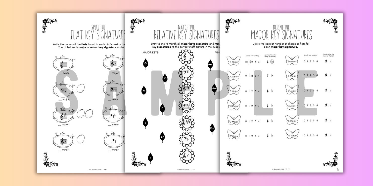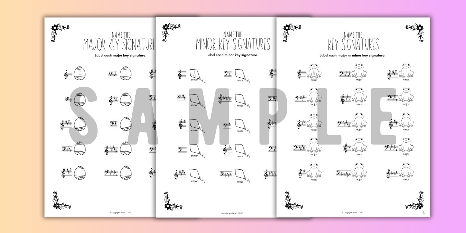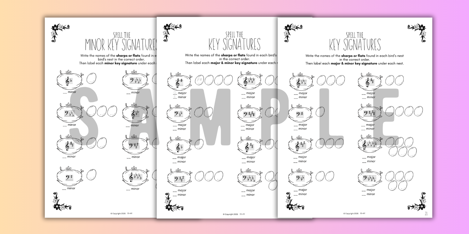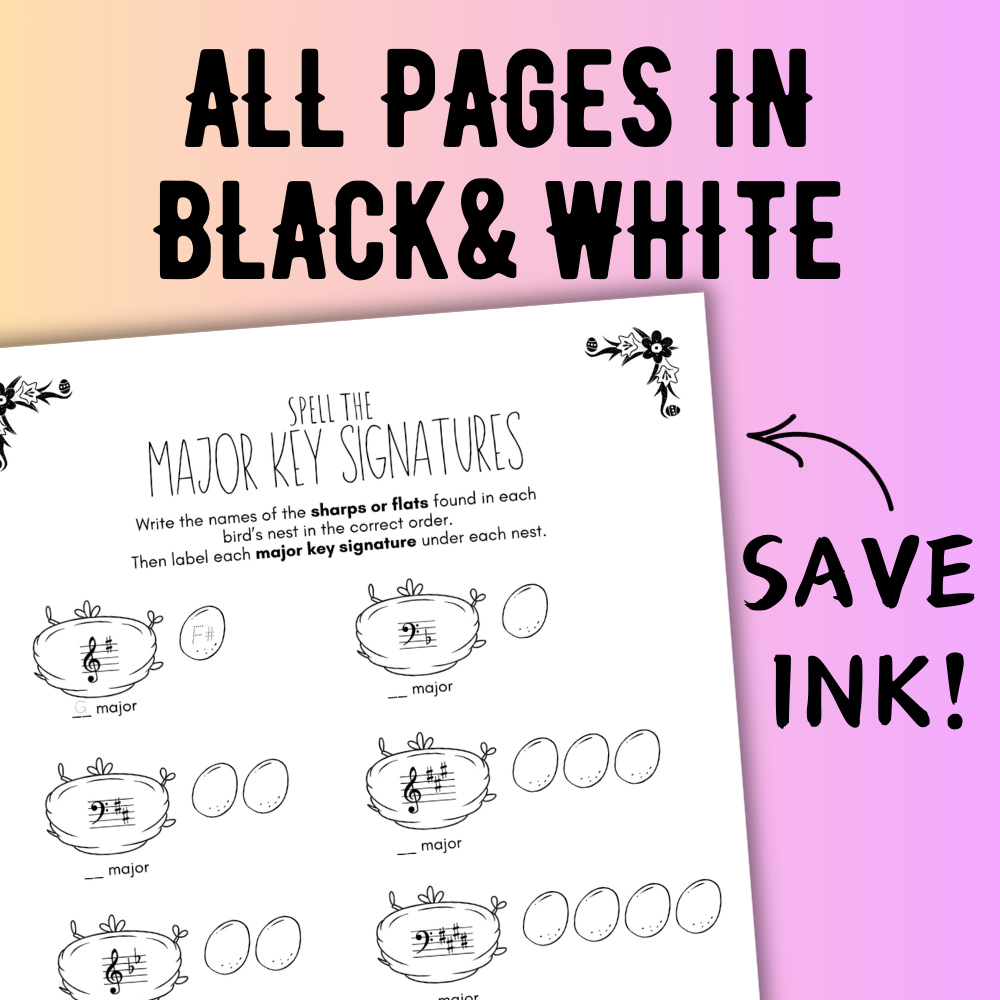 Pack of 30 No-Prep Print-and-Go Spring Music Theory Key Signature Worksheets for elementary to intermediate piano students. Printable worksheets review identifying and drawing all major and minor key signatures.
