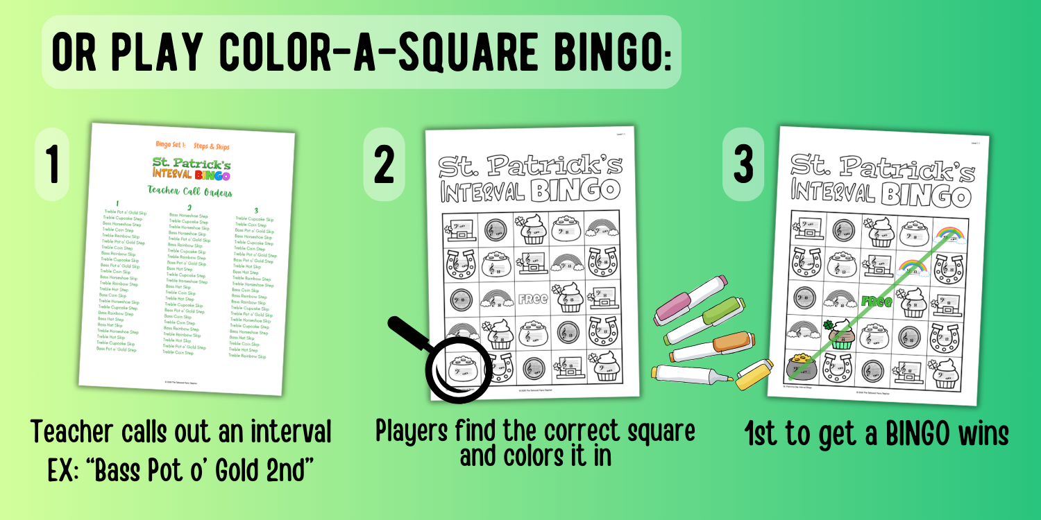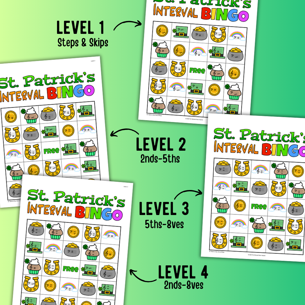 Saint Patricks Day Interval Bingo for Music Students. Celebrate lucky leprechaun season with a music game break in March! Perfect for private piano instructors or group piano classes.