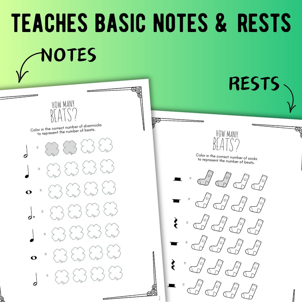 Music Theory Worksheet Pack | Note & Rest Values | St Patricks Day Theme for March