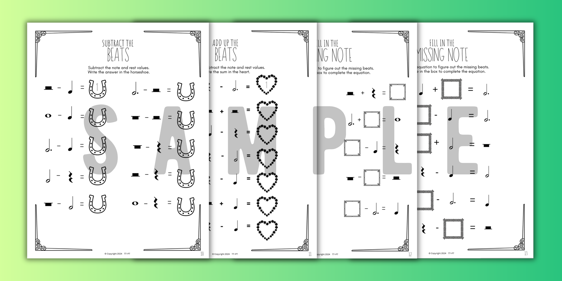 Pack of 12 No-Prep Print-and-Go Saint Patrick's Day Music Theory Worksheets for beginning piano students. Printable worksheets for March review rhythms including note values, rest values, and music math equations.