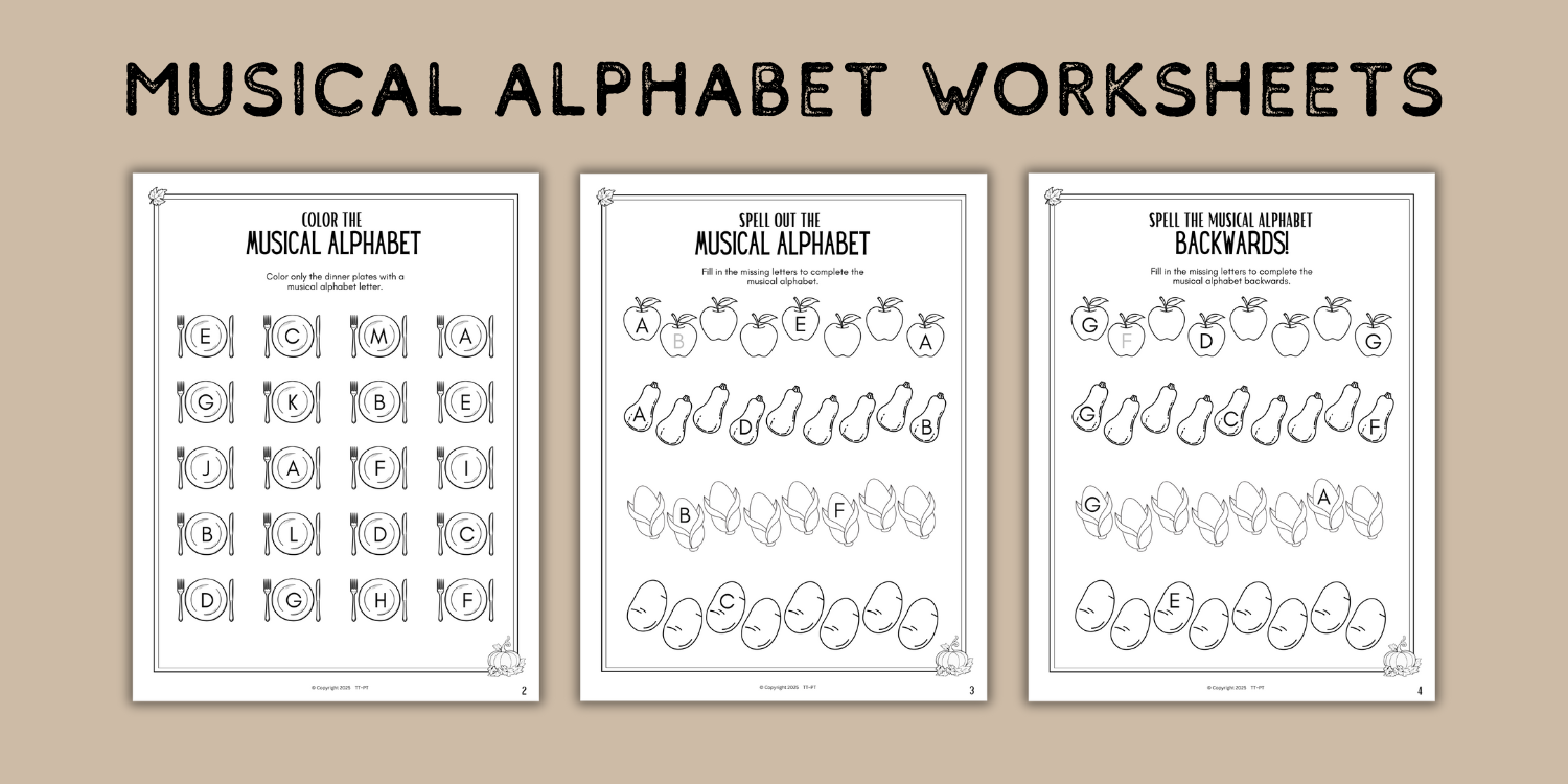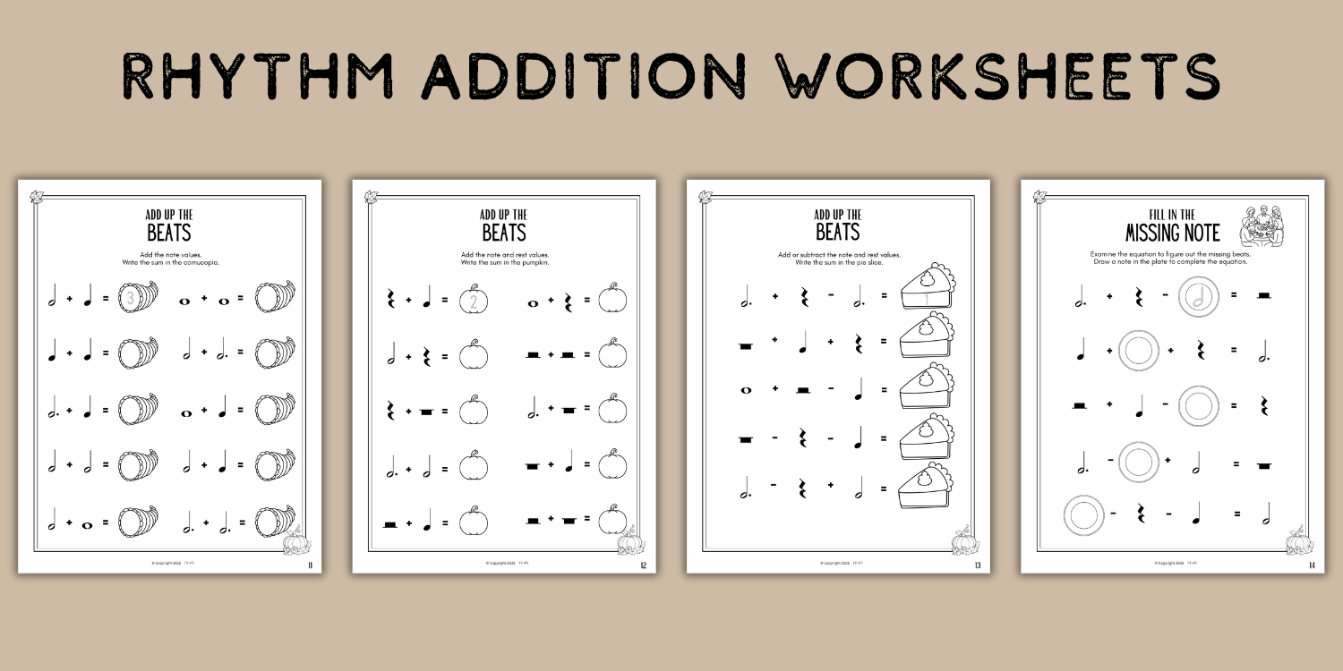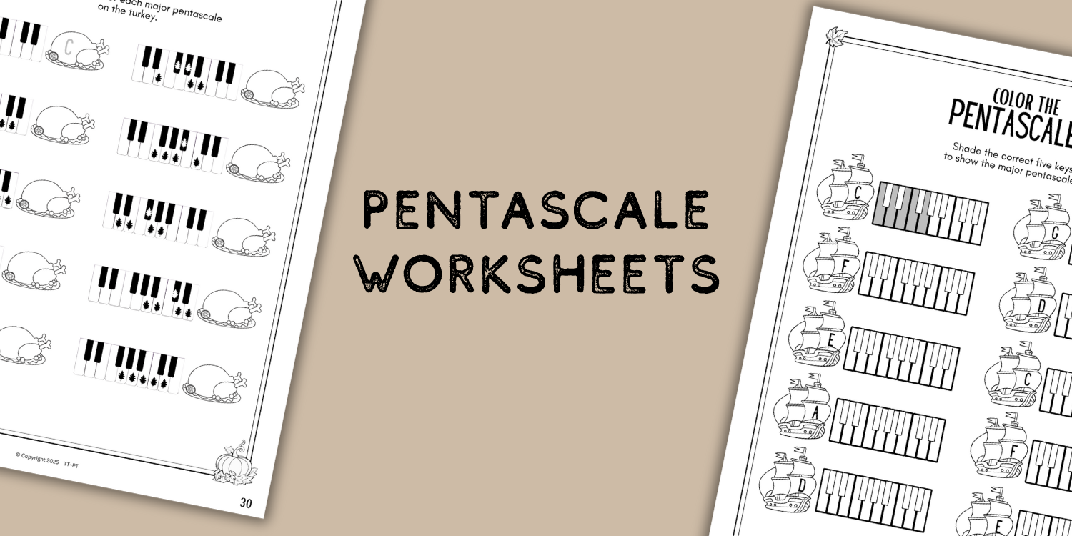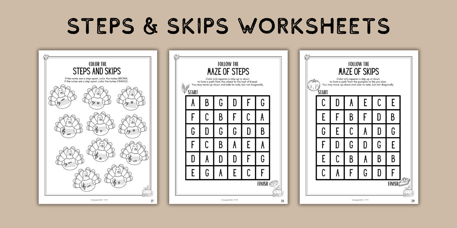 🦃 Thanksgiving Music Worksheets – 30 theory worksheets covering notes, rhythm, steps/skips, and scales. Answer key included.