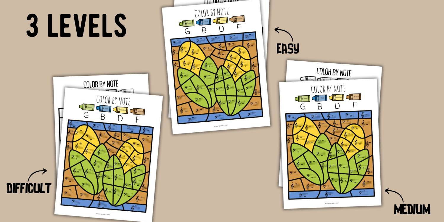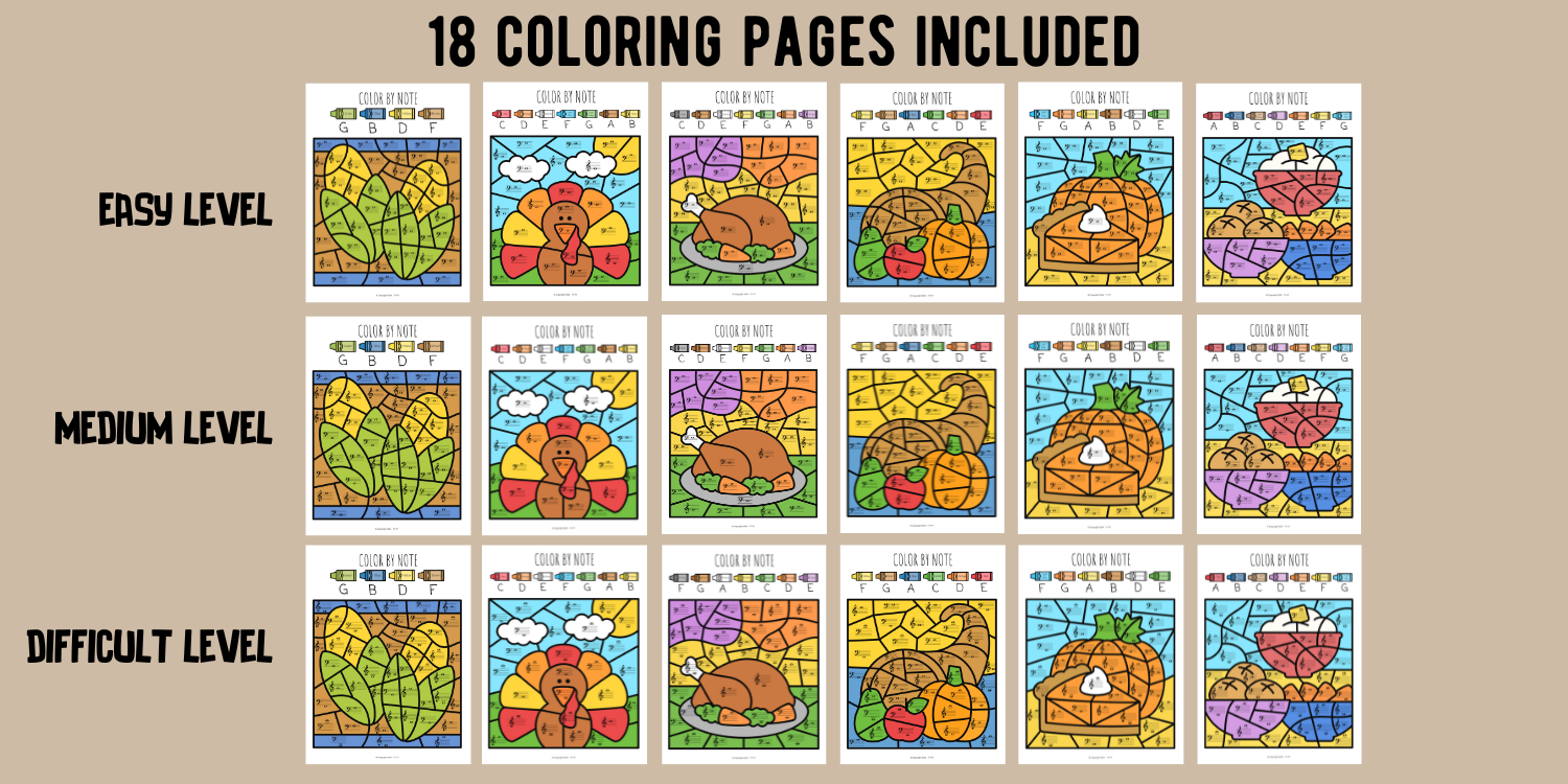 🎨 Thanksgiving Color-By-Note Pages – 18 printable music coloring sheets in 3 levels of difficulty.