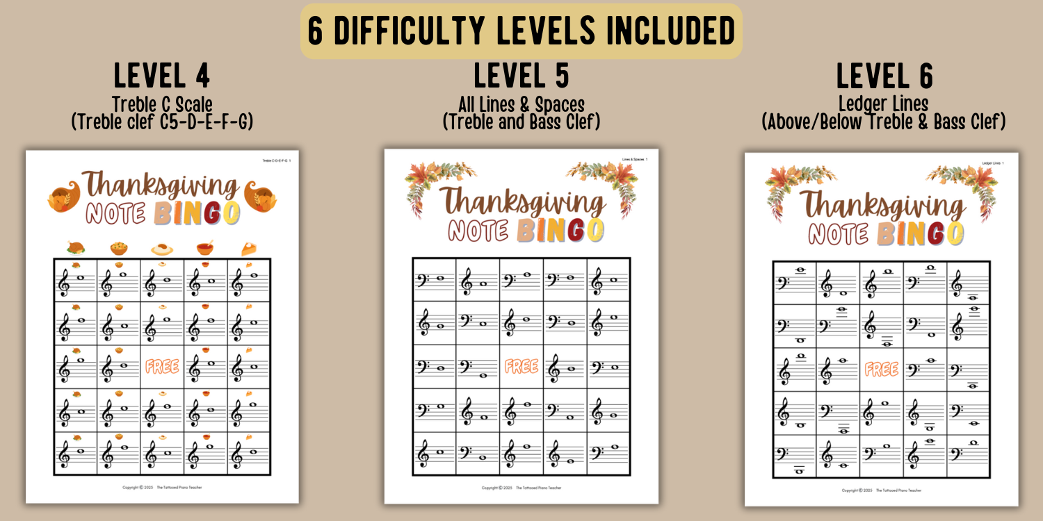 🎼 Thanksgiving Note Bingo – Review notes on the staff with 6 levels of difficulty, from beginner to advanced ledger line reading.