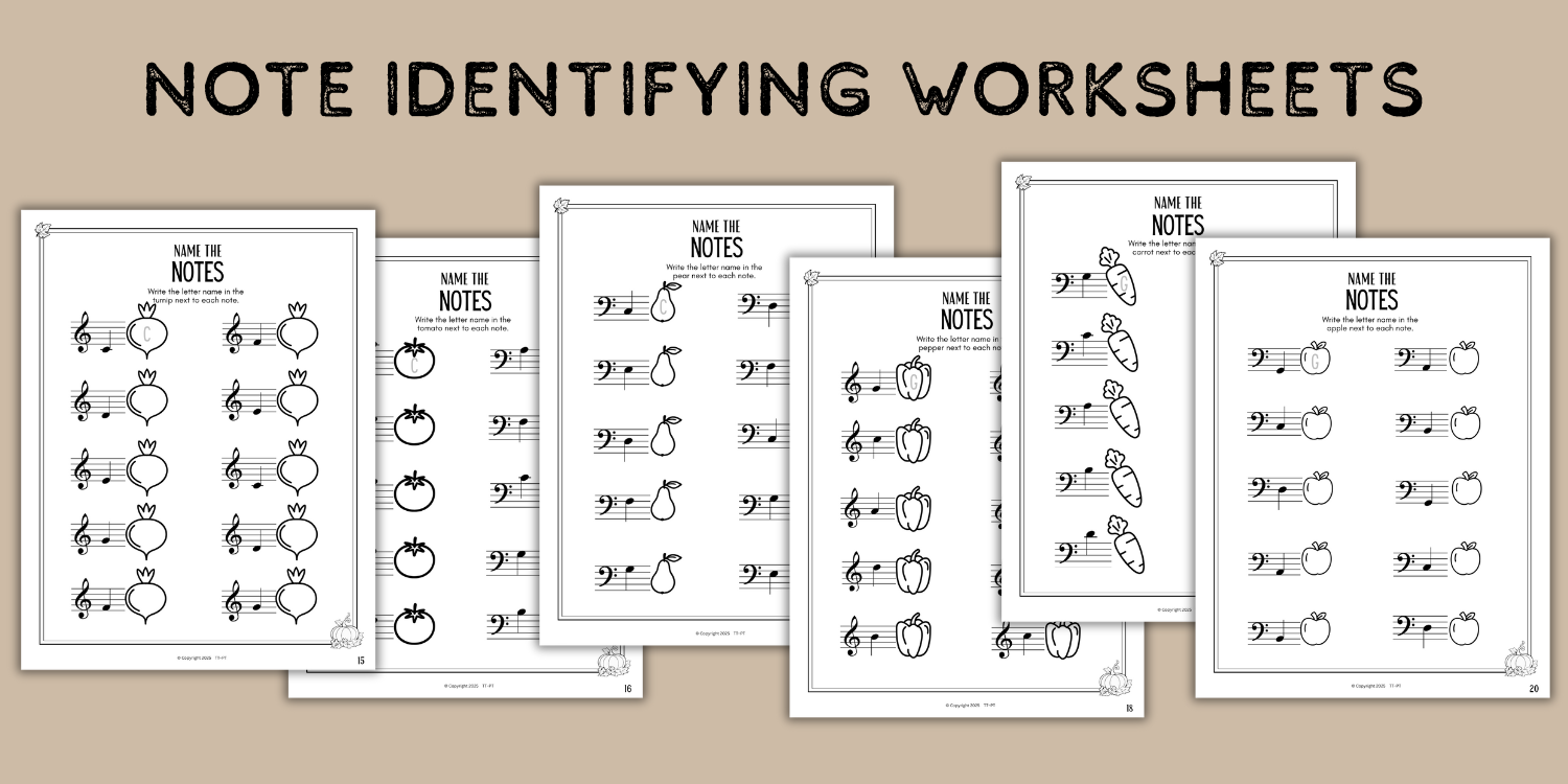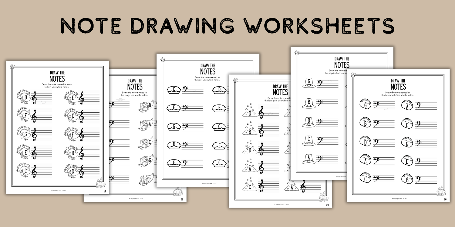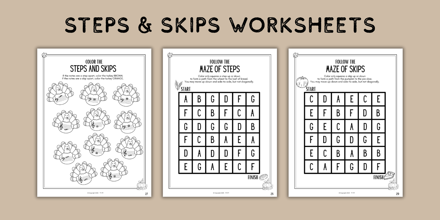 Pack of 30 No-Prep Print-and-Go Thanksgiving Music Theory Worksheets for beginning piano students. Printable worksheets review notes on the staff, note and rest values, piano key names, steps vs skips, and major pentascales. Answer key included.