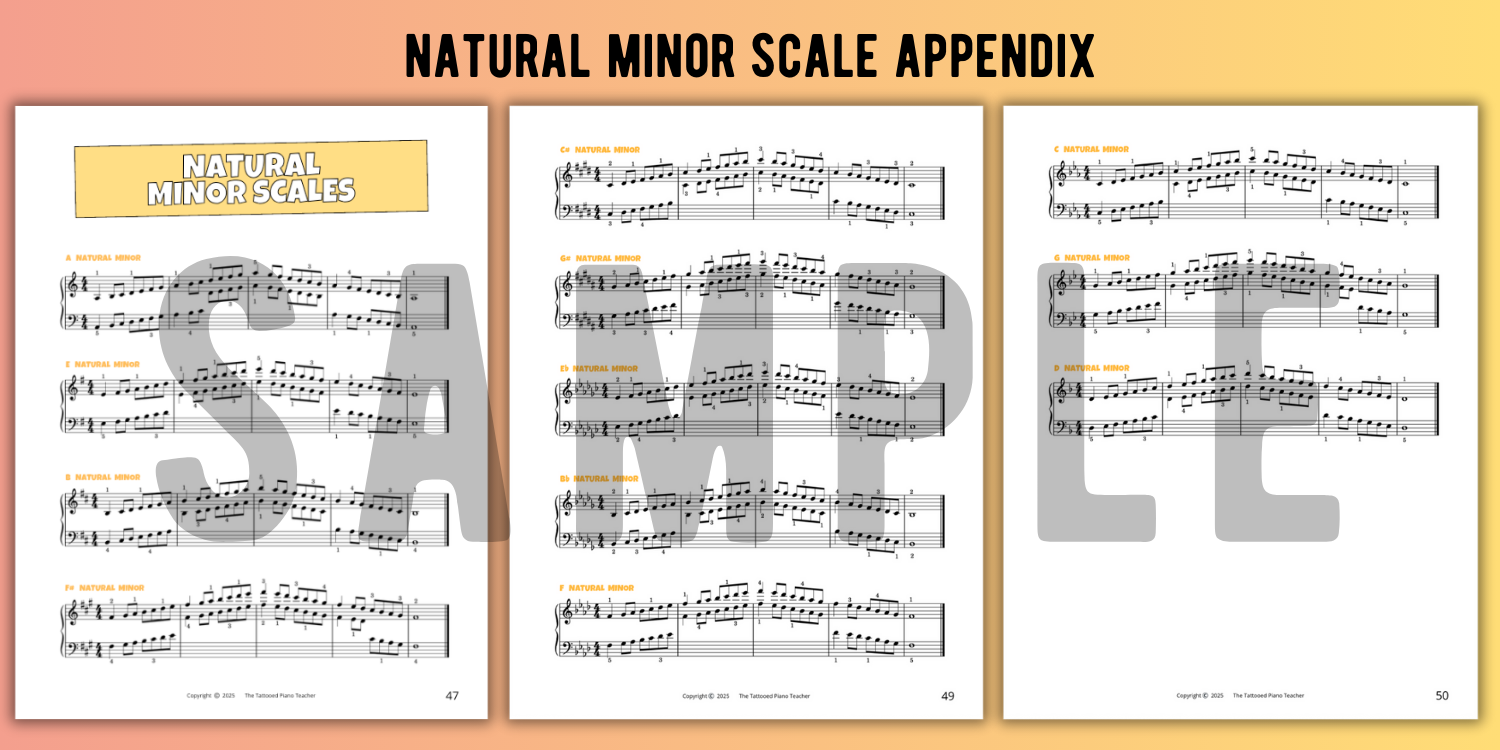 Minor warm-up sheets include the same as major warm-up sheets except that the hands together one-octave scale is replaced with 2 hands separate two-octave scales: one in natural minor and one in harmonic minor.