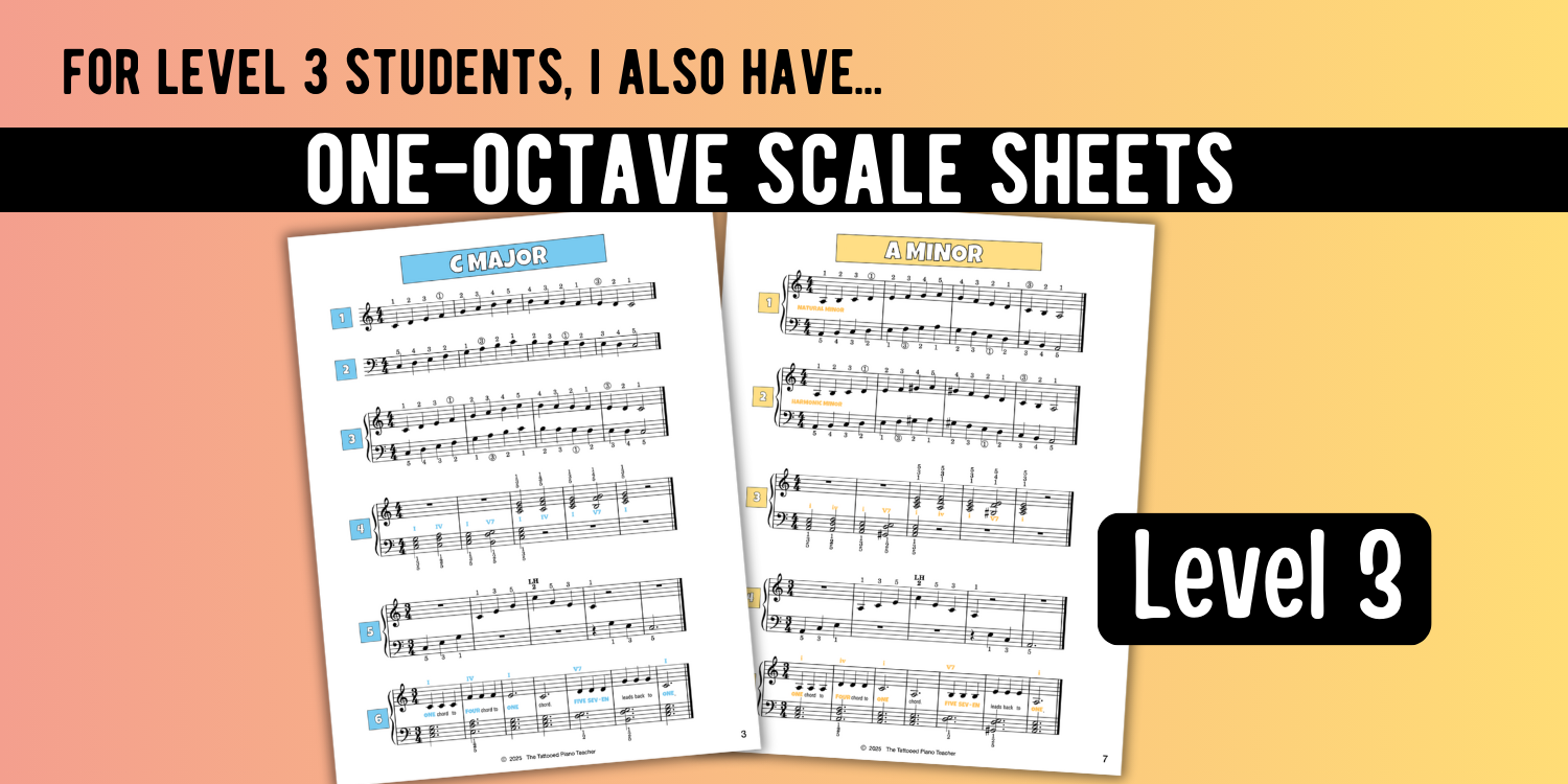 This comprehensive pack of 58 technique sheets covers all one-octave major and minor scales, two-octave major and minor scales, I-IV-V7 triads, and arpeggios. The individual sections give you, the teacher, an easy way to pace your Level 4 students so there is no overwhelm...just real mastery!