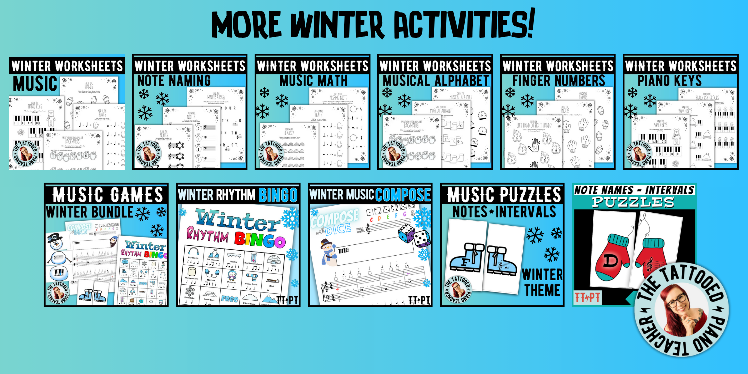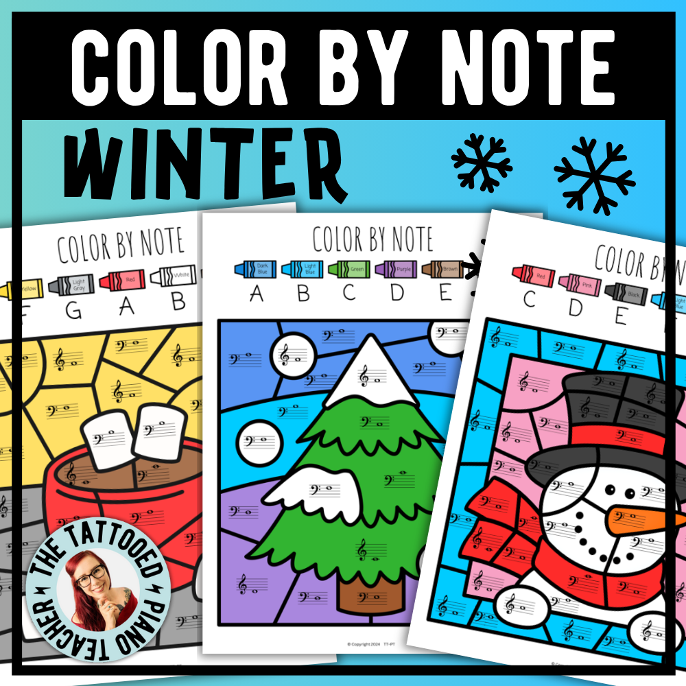 18 No-Prep Print-and-Go Winter Music Coloring Pages for beginning to intermediate piano students. Printable color-by-code worksheets to identify music notes on the staff. Snow themed Coloring Pictures for a fun music theory break this January!