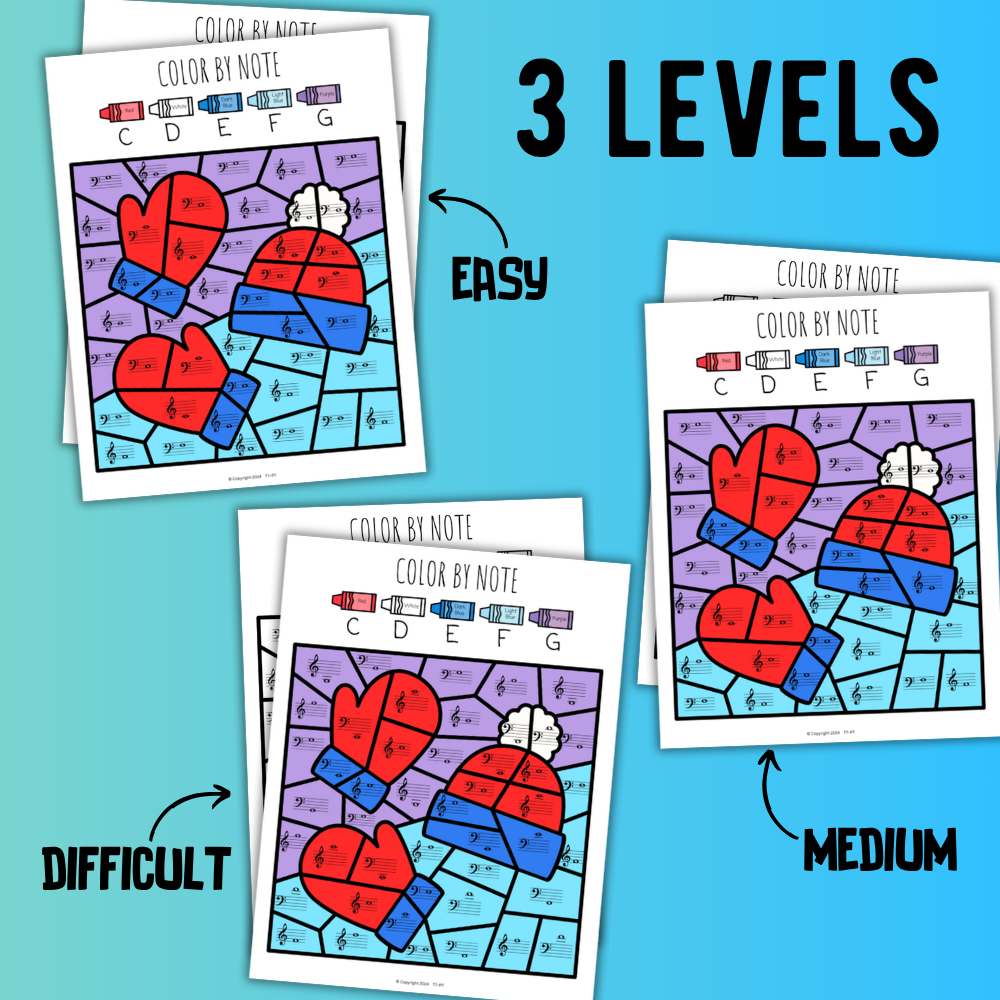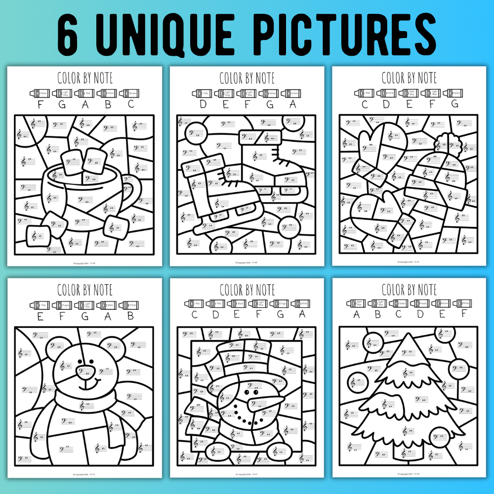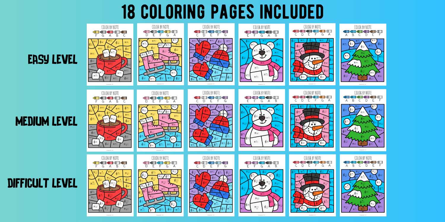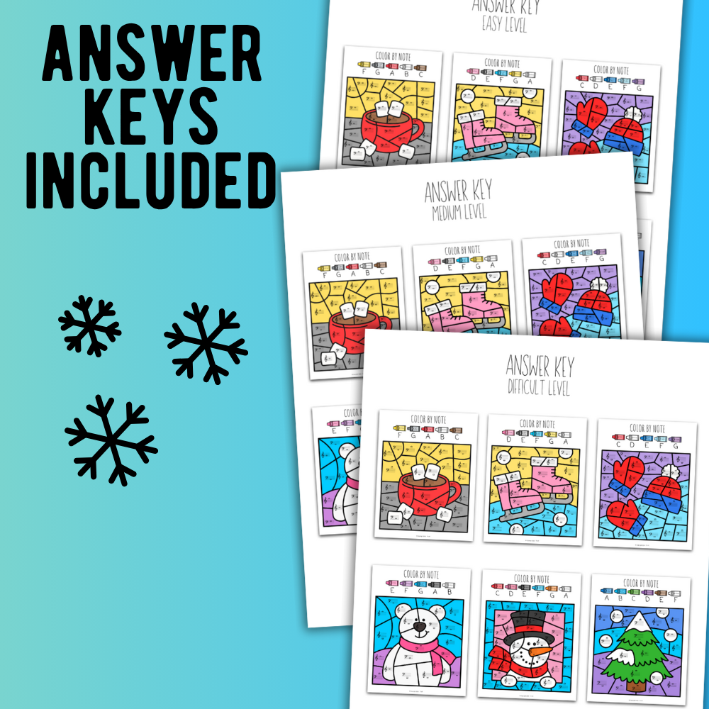 Winter Music Coloring Pages | Color By Code Music Notes | 3 Levels | Note Naming | January