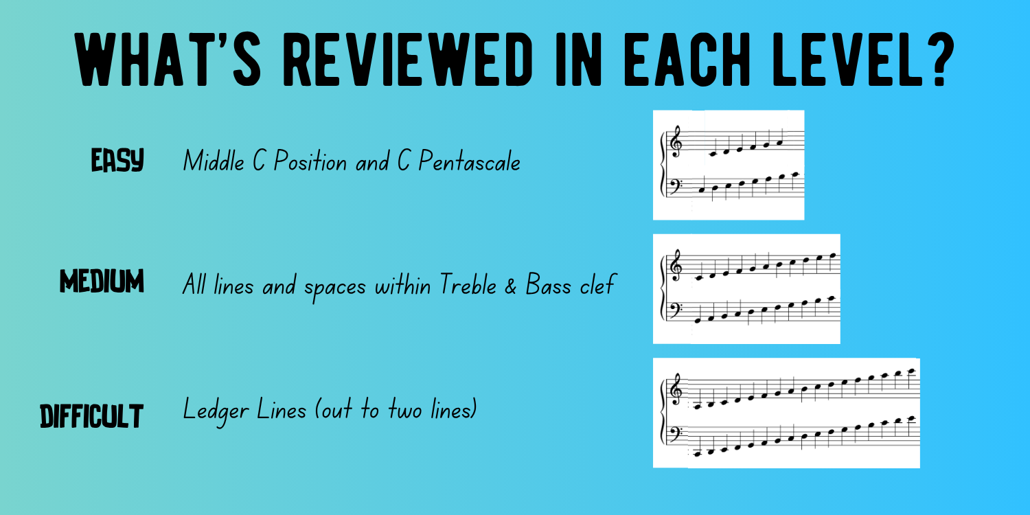 ★ Easy Level: mostly Middle C Position and C Scale notes (Bass Clef & Treble Clef Notes)