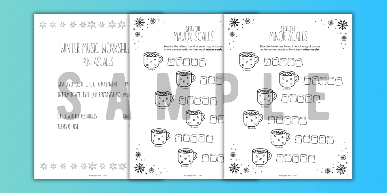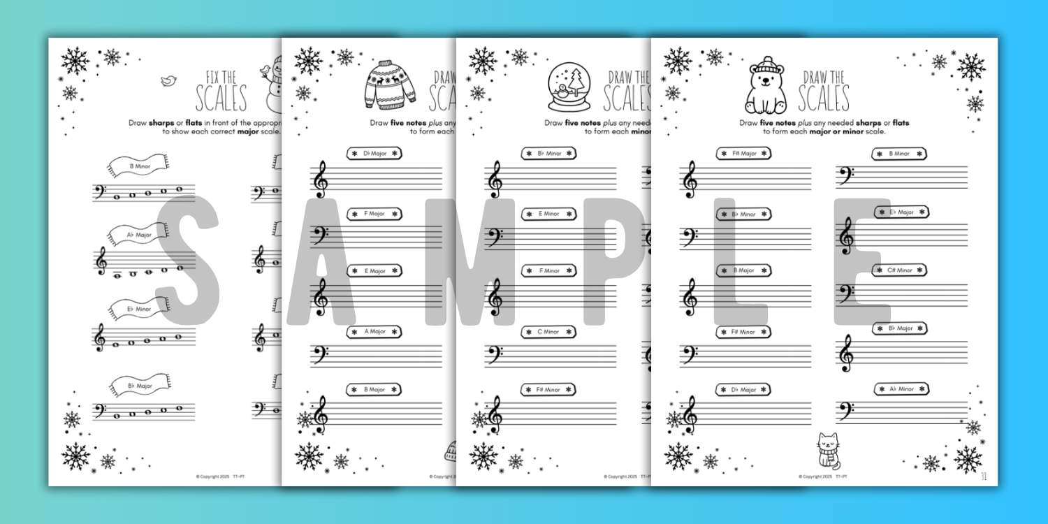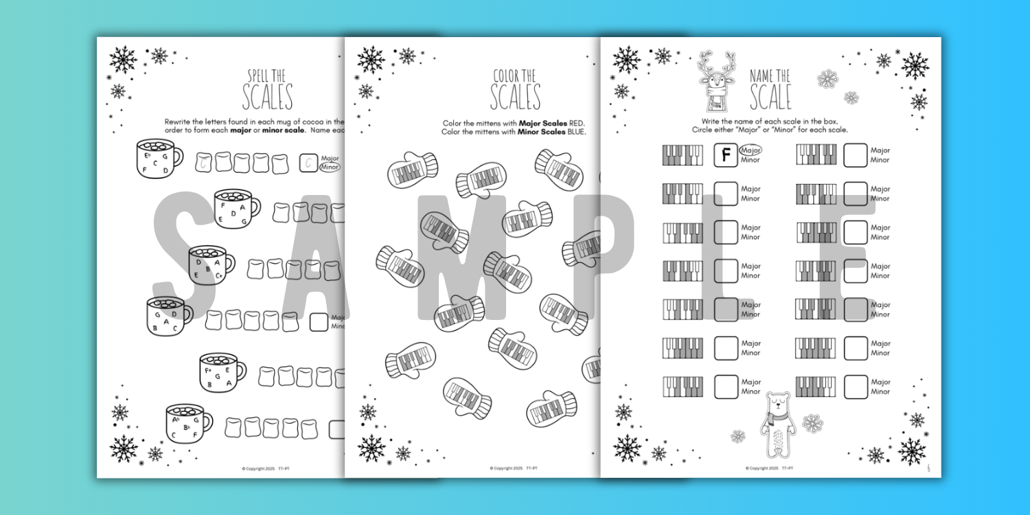Pack of 30 No-Prep Print-and-Go Winter Music Theory Scales Worksheets for elementary to intermediate piano students. Printable worksheets for those chilly days of January review identifying all major and minor pentascales (5-finger scales) on the keys and on the staff.